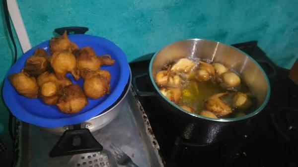 Coloque o óleo esquentando numa panela e, quando estiver bem quente, baixe um pouco o fogo. Modele porções da massa com as suas mãos untadas com óleo ou com duas colheres de sopa e coloque fritando.