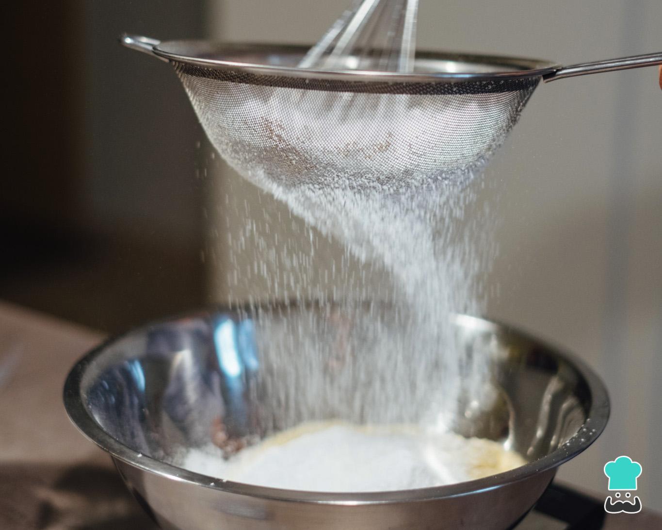 Comece esta receita de bolinho de chuva peneirando a farinha para uma tigela grande. Adicione o açúcar e o fermento e misture.