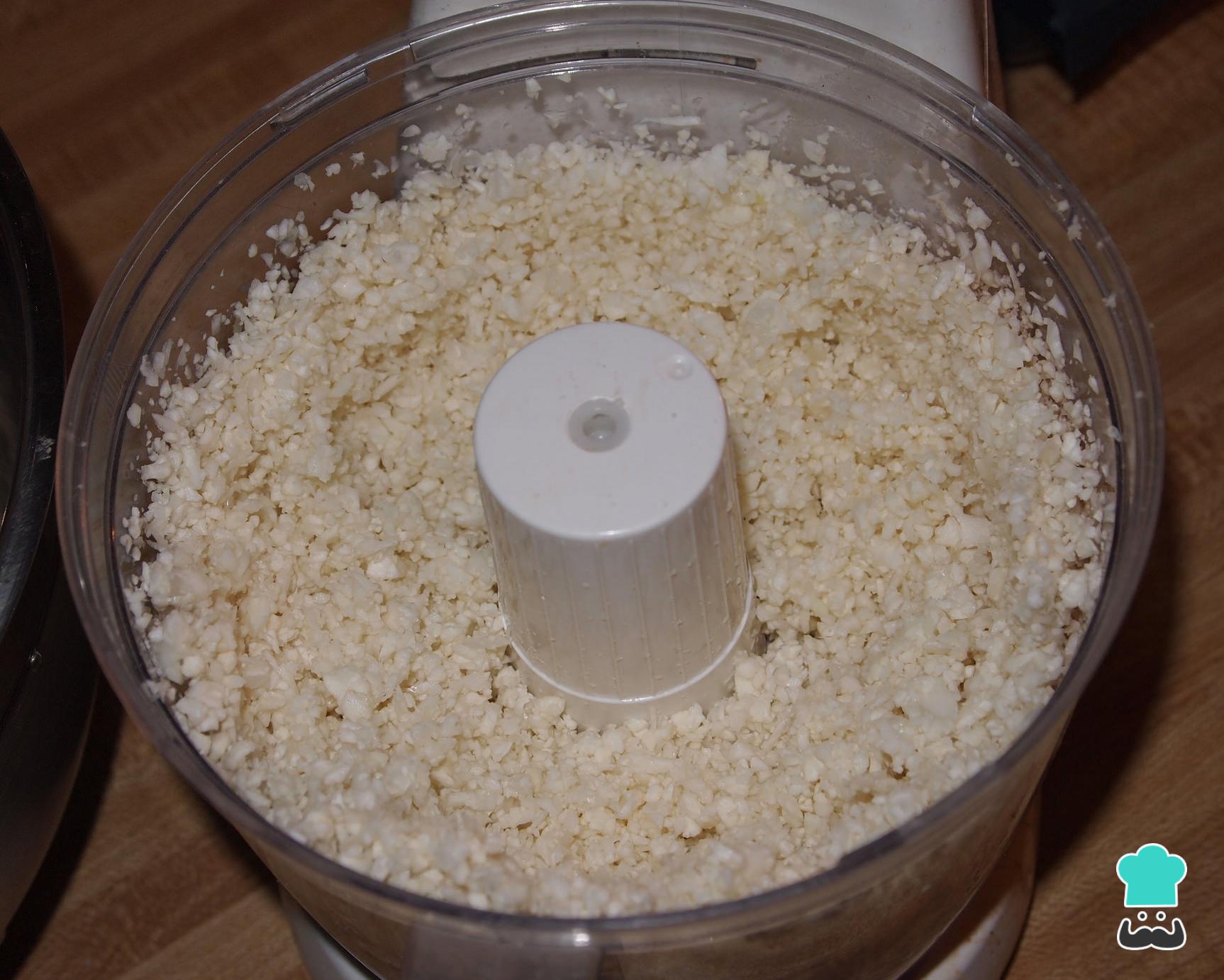 Primeiramente separe a couve flor em floretes, lave e pique finamente com uma faca ou no processador de alimentos, até obter uma "farofa" como na foto.