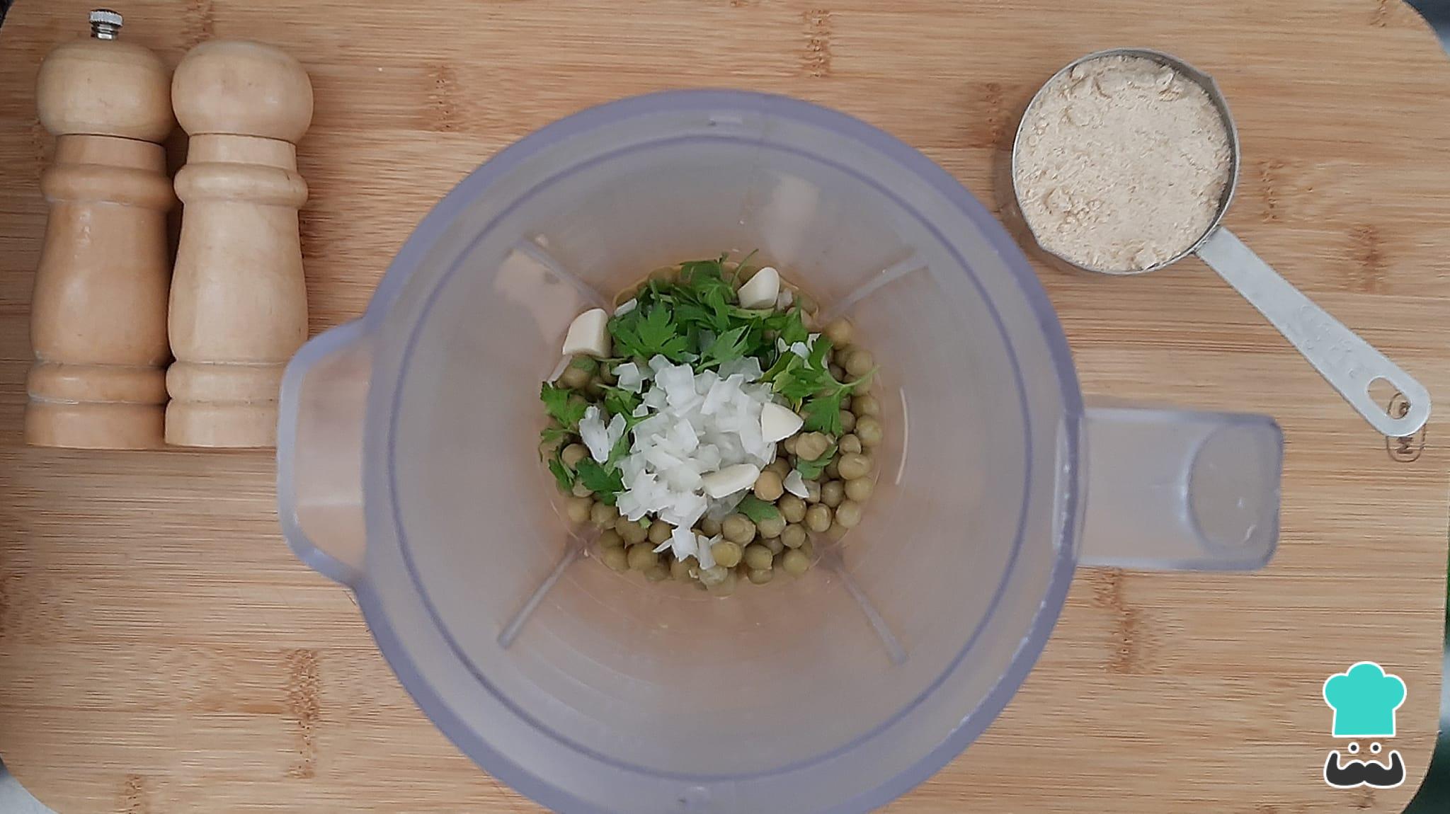 Coloque a ervilha, a cebola, o cheiro verde, o alho e o ovo no liquidificador ou processador para triturar todos os ingredientes, formando uma pastinha.