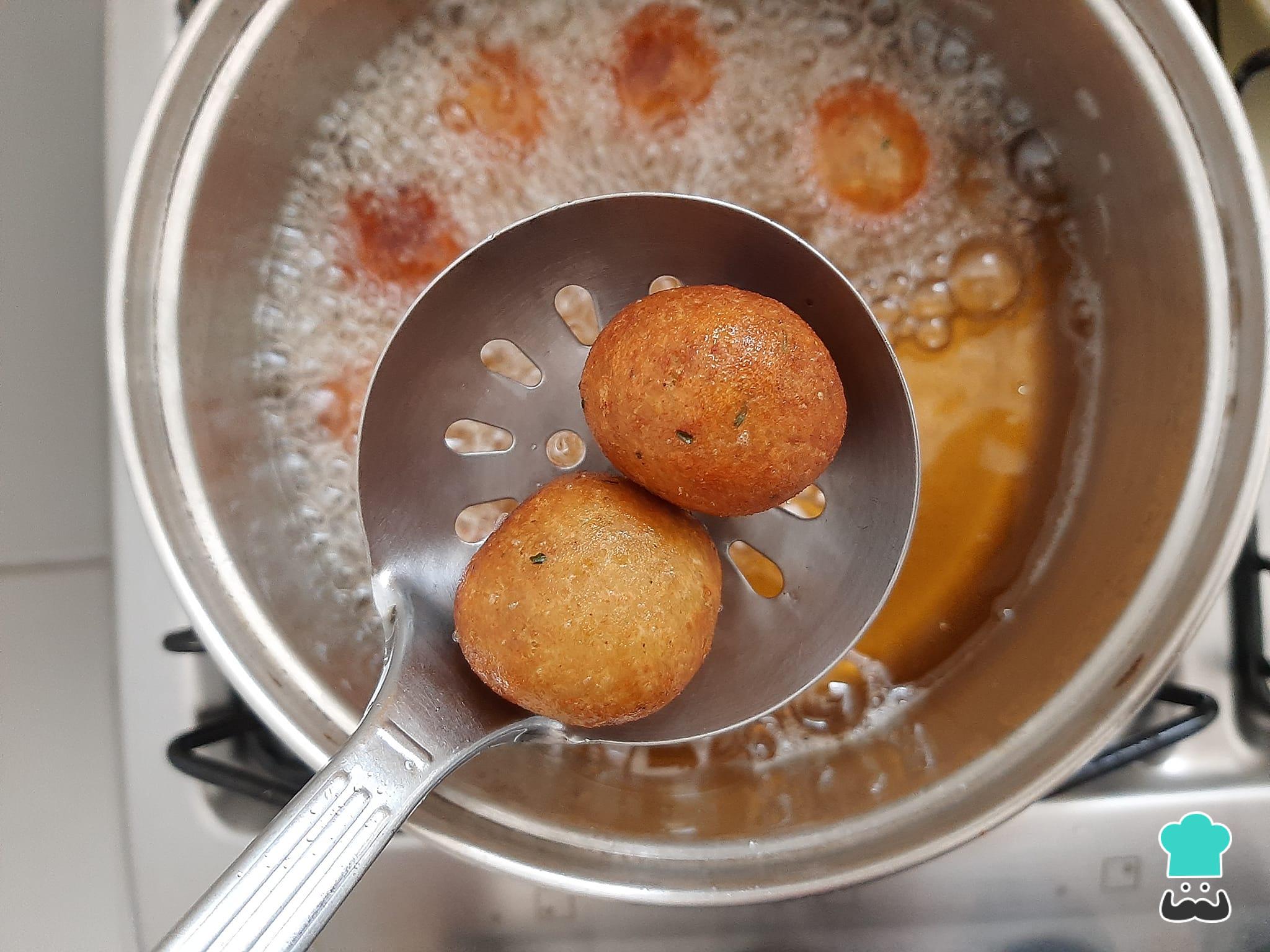Depois de modelar todos os bolinhos, você poderá optar por fritar em óleo quente por imersão, até que fiquem dourados ou se preferir, congele-os, levando-os ao freezer num recipiente aberto, separadamente por 1 hora e em seguida, quando estiverem mais firmes, armazene-os em saquinhos próprios para freezer.