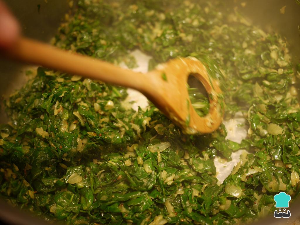 Comece preparando o bolinho de espinafre separando as folhas de espinafre e lavando-as. Escorra e refogue numa frigideira com o azeite e a cebola até murchar. Desligue o fogo e deixe amornar.