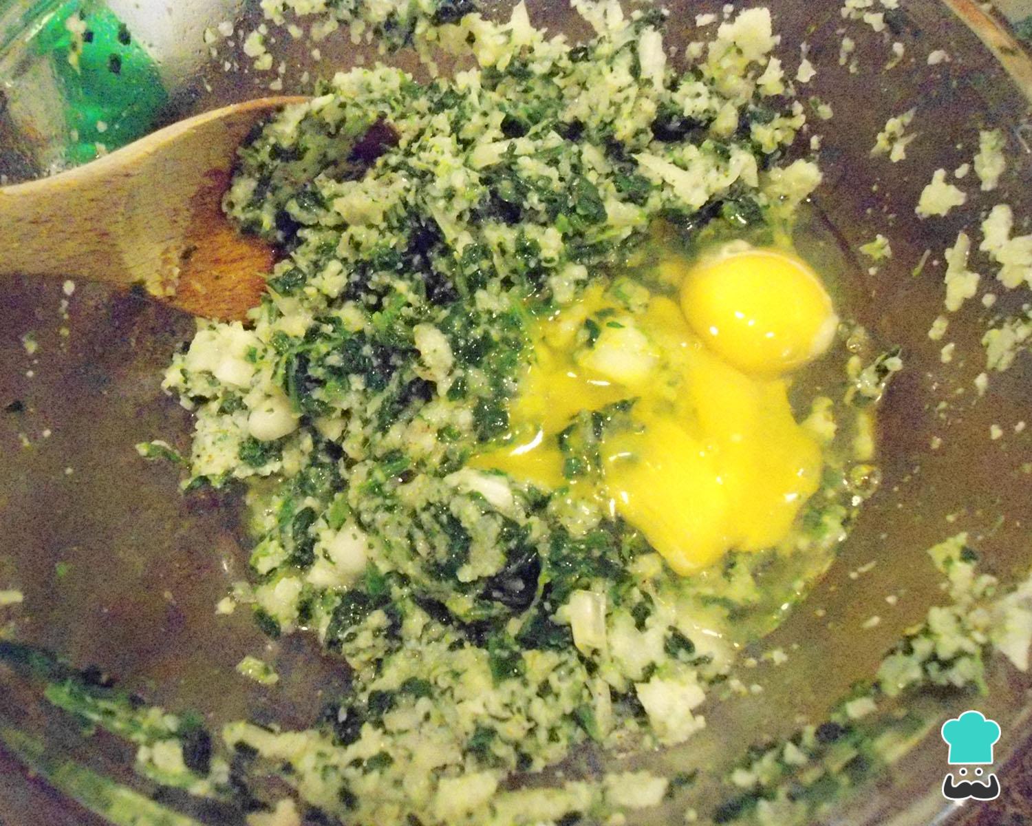 Coloque o espinafre em uma tigela com o arroz, o ovo batido, o queijo e a farinha de rosca. Tempere a gosto com sal e pimenta e misture tudo muito bem até obter uma massa fácil de modelar. Sinta a massa nas suas mãos: se estiver mole acrescente mais farinha, se estiver seca e desfazendo acrescente mais um ovo.