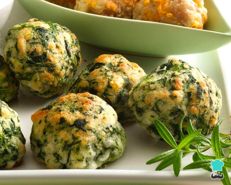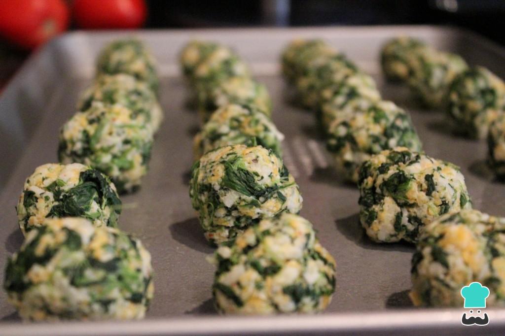 Em seguida molde a massa em forma de bolinhas, como se fossem almôndegas de espinafre. Em seguida você pode fritar em óleo quente ou assar no forno a 200ºC até dourar, uma sugestão menos calórica.