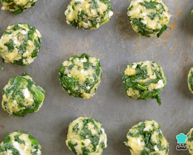 Modele bolinhos de espinafre com a massa, pressionando bem com as mãos para não desmancharem, e coloque em uma assadeira untada ou tabuleiro de forno com papel manteiga. Coloque no forno a 200ºC por 10 minutos, ou até dourar.