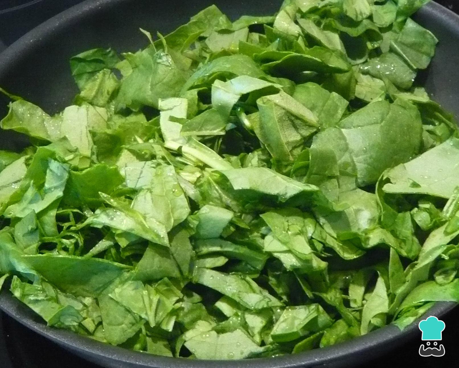 Leve ao fogo uma frigideira com um fio de óleo ou de azeite e refogue o espinafre com o alho picado. Deixe por 3-5 minutos, mexendo de vez em quando, até o espinafre soltar água e murchar.