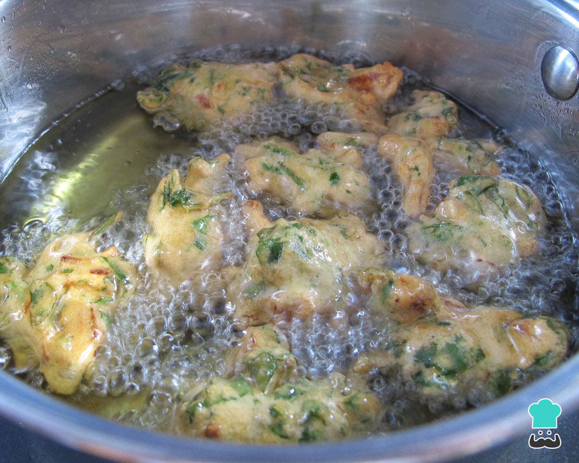 Misture o espinafre e alho refogados com os ingredientes do primeiro passo. Esquente o óleo para fritar e coloque fritando algumas colheradas da mistura de bolinho de espinafre sem ovo até dourar.