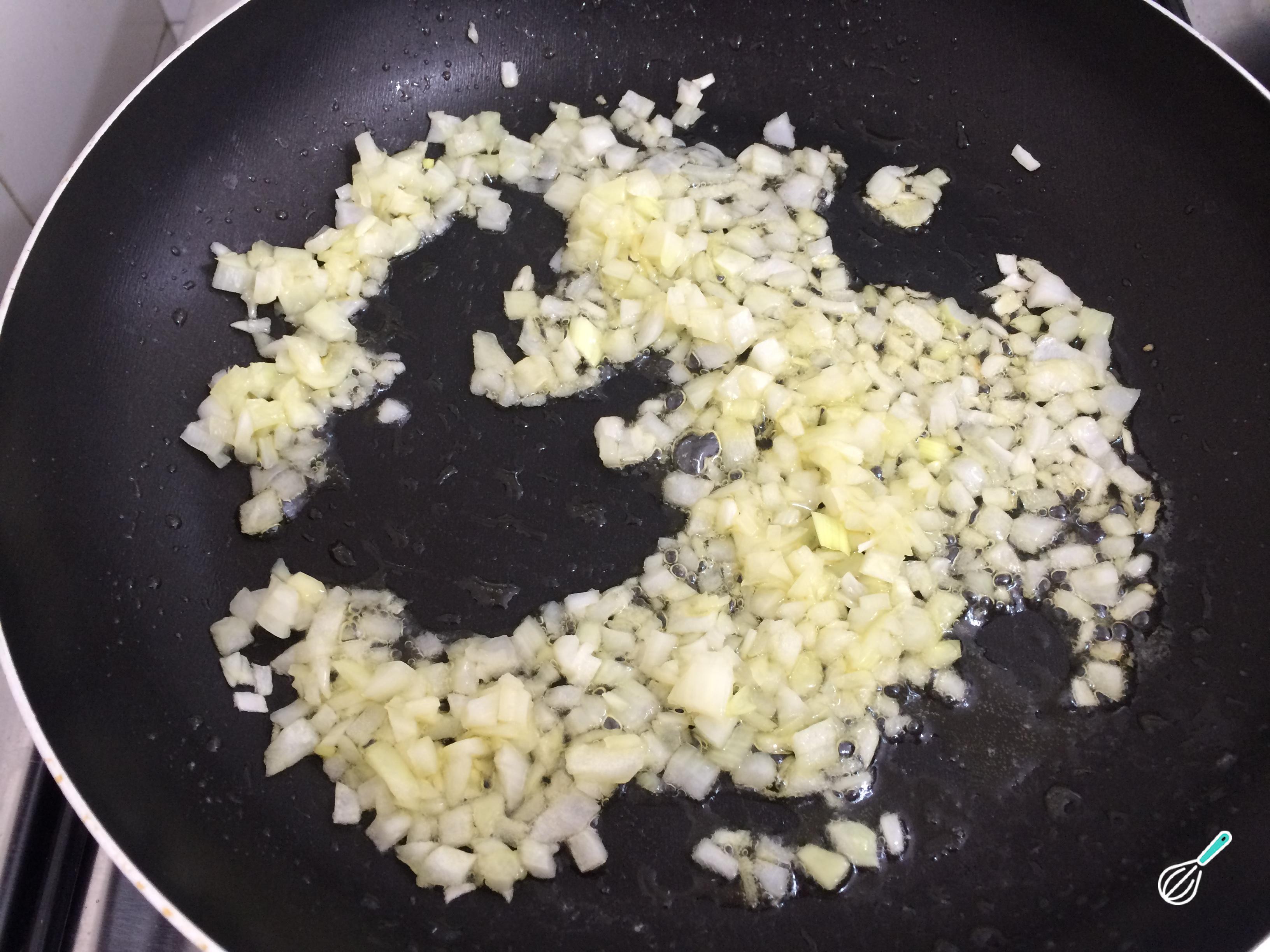O primeiro passo desta receita vegana com espinafre é picar a cebola e refogar no azeite até ficar transparente.