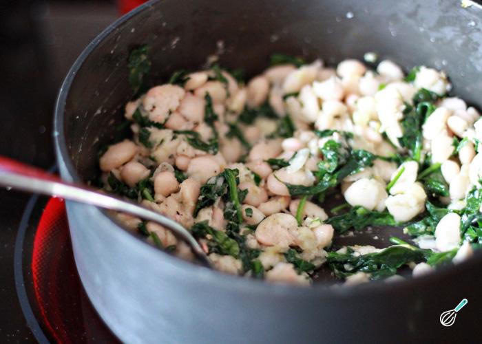 Em seguida adicione o espinafre e deixe cozinhar, mexendo de vez em quando, até murchar. Tempere a gosto com sal e pimenta, desligue o fogo e deixe esfriar um pouco.