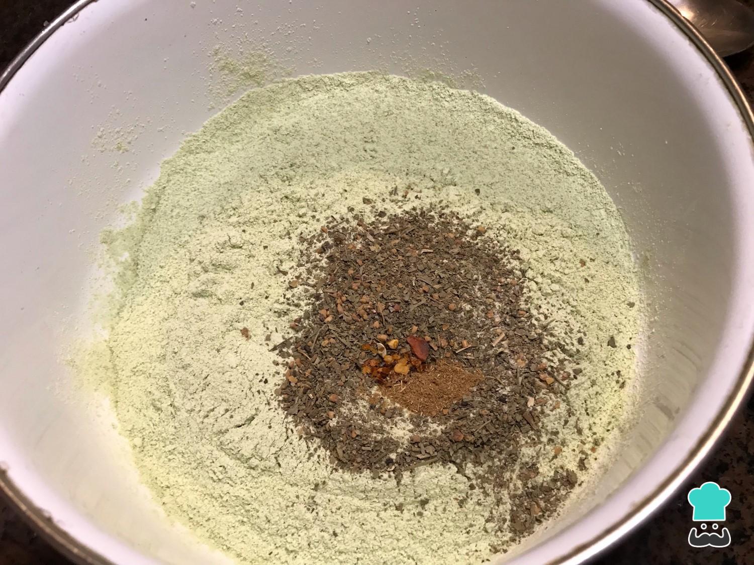 Misture todos os ingredientes secos numa tigela: a farinha de ervilhas, as ervas de Provence, a páprica e os cominhos. Escolhemos a farinha de ervilha que, além de ser muito proteica, resulta nuns nuggets coloridos e atraentes para as crianças.