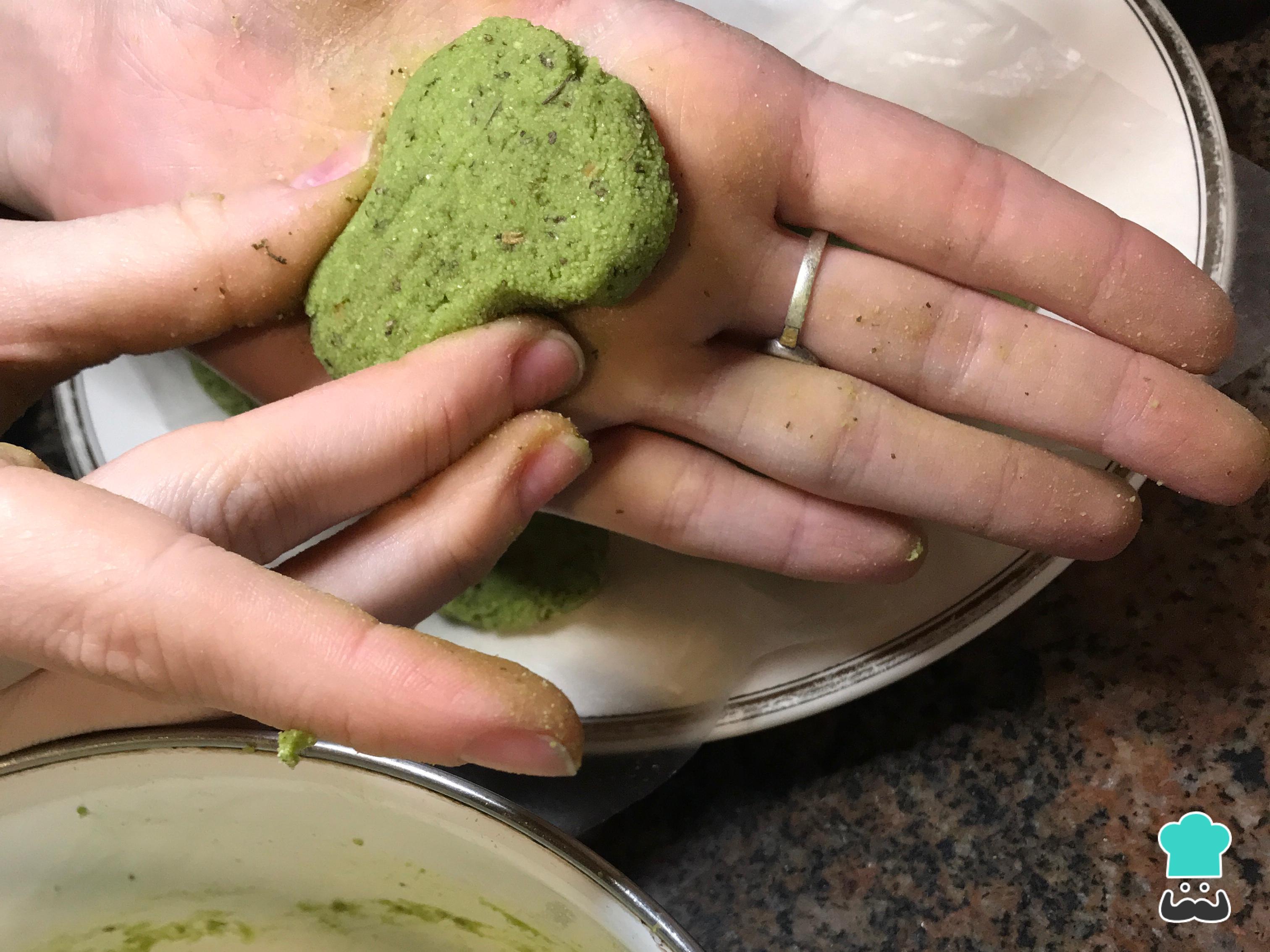Para modelar os nuggets caseiros, pegue um pouco de massa e role em forma de bola com a palma das suas mãos. Em seguida, pressione para espalmar a bola e ficar compacta, como na foto.