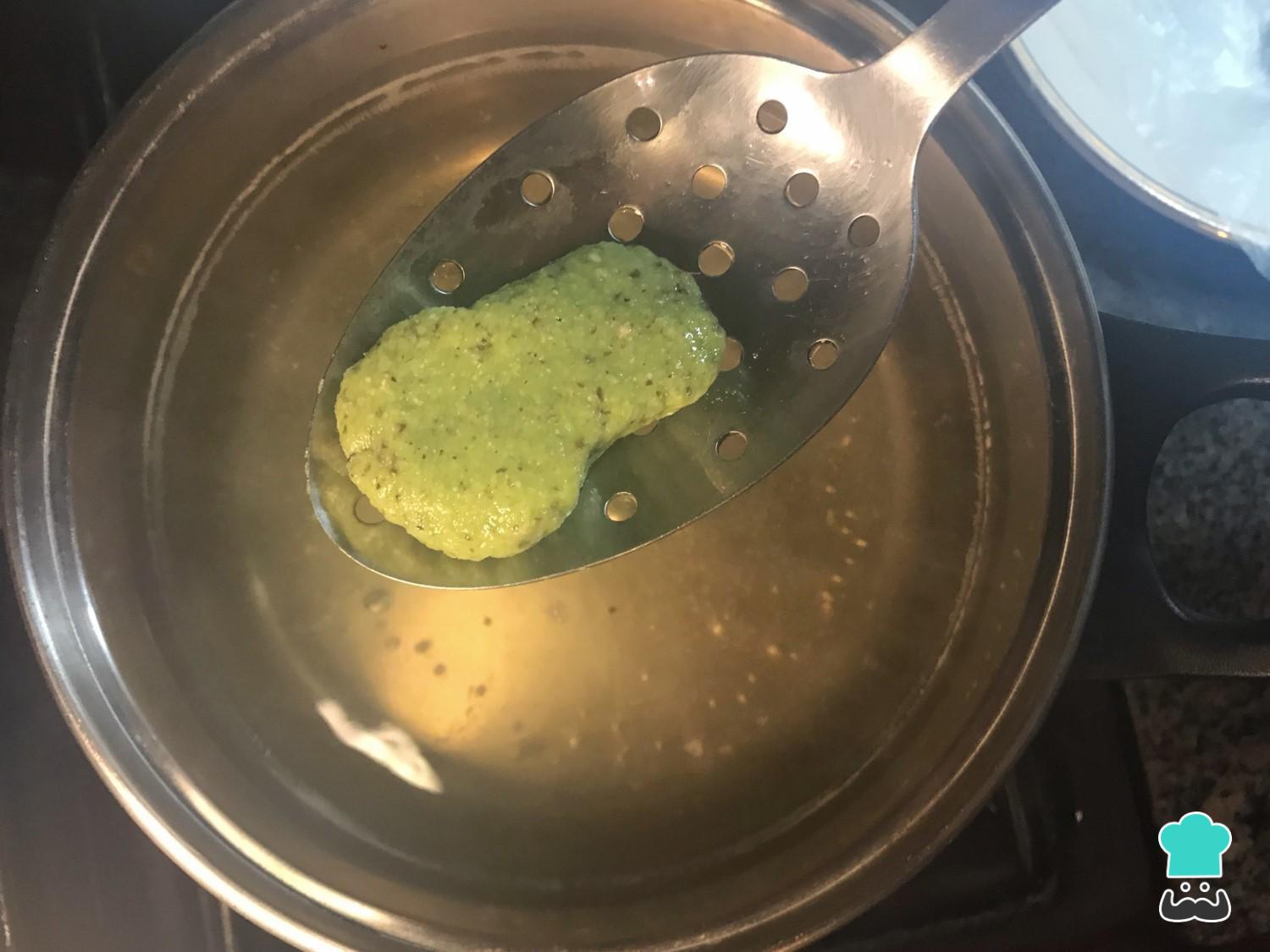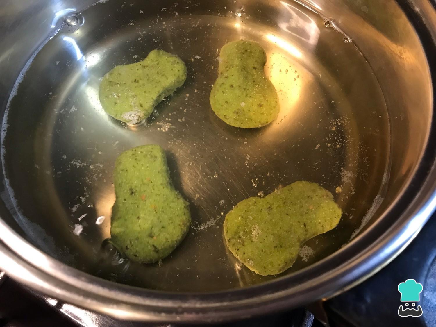 Em seguida será necessário ferver o bolinho de farinha de ervilha numa panela com água ou caldo de legumes fervente por aproximadamente 5-7 minutos.