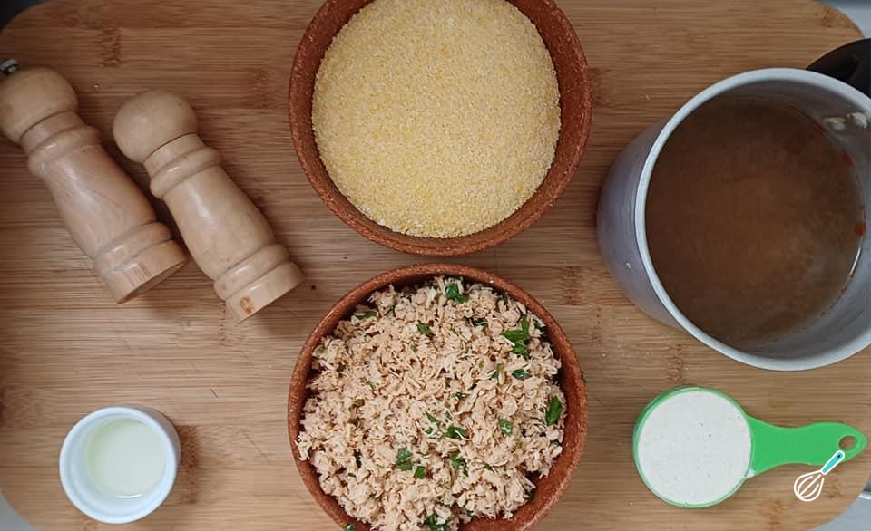 Separe os ingredientes necessários para preparar a receita de bolinho de farinha de milho caipira.