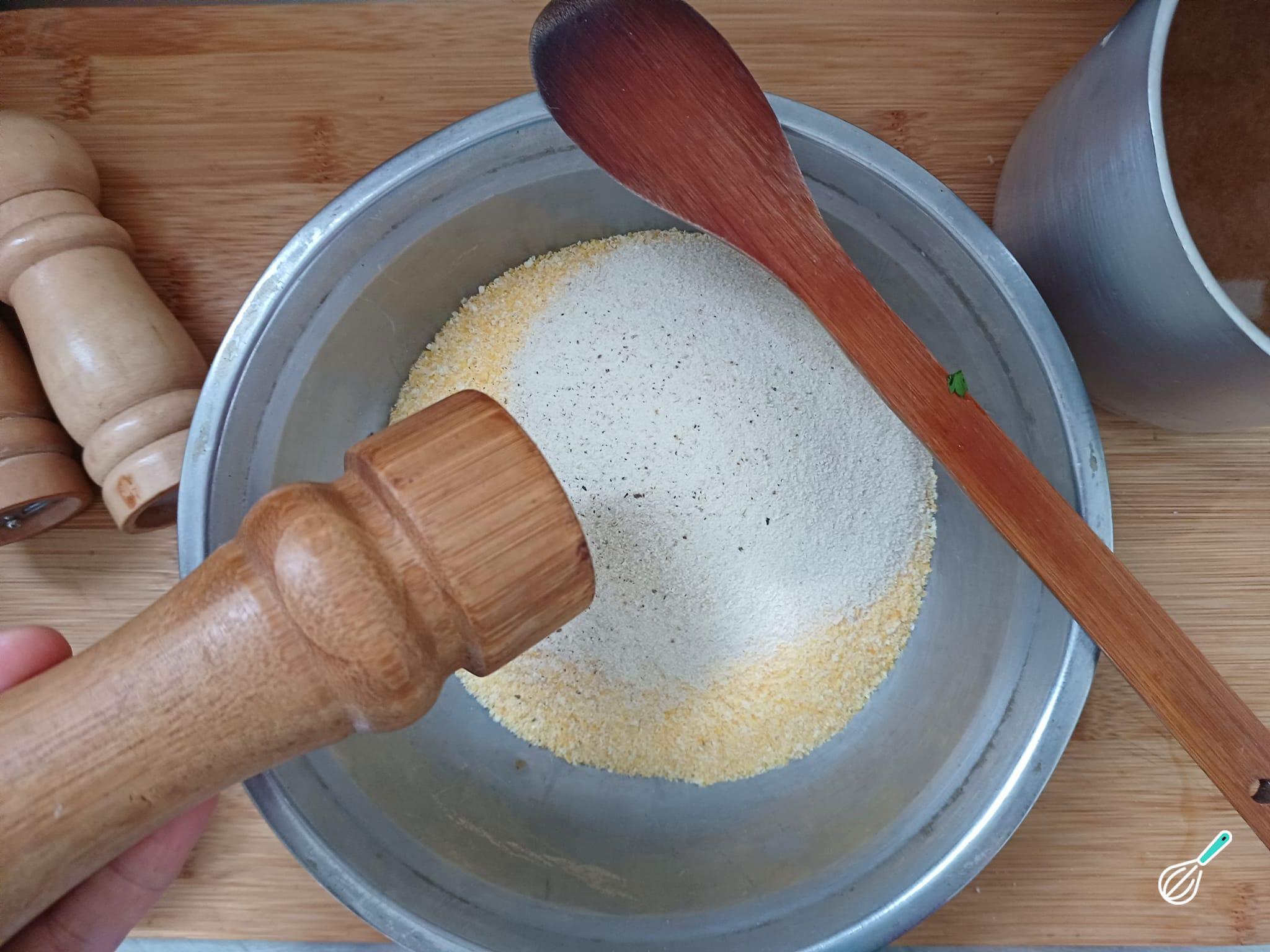 Num bowl, junte a farinha de milho com a farinha de mandioca e o sal.
