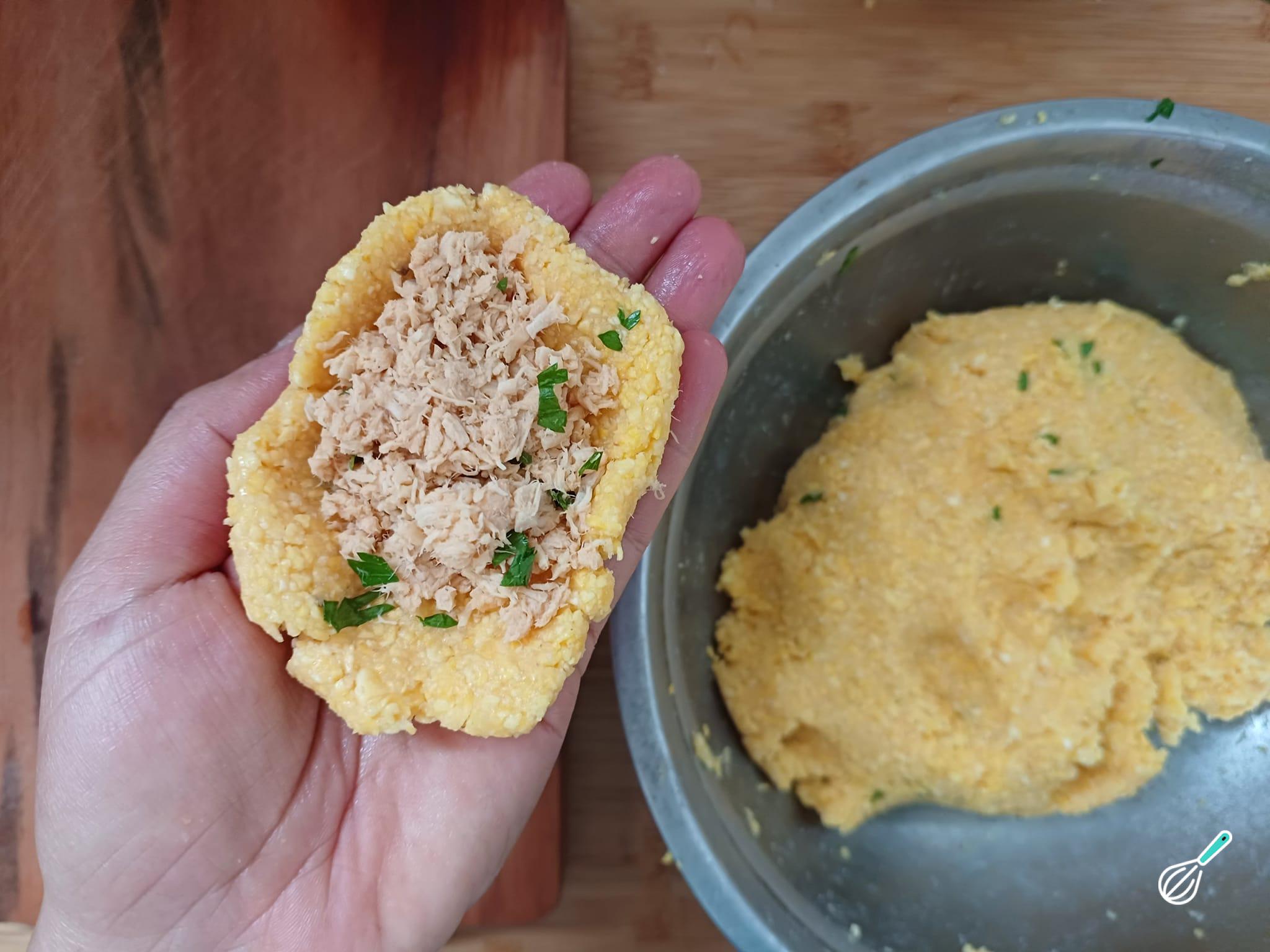 Misture salsinha picada na massa e pegue porções com as mãos umedecidas com água ou óleo.