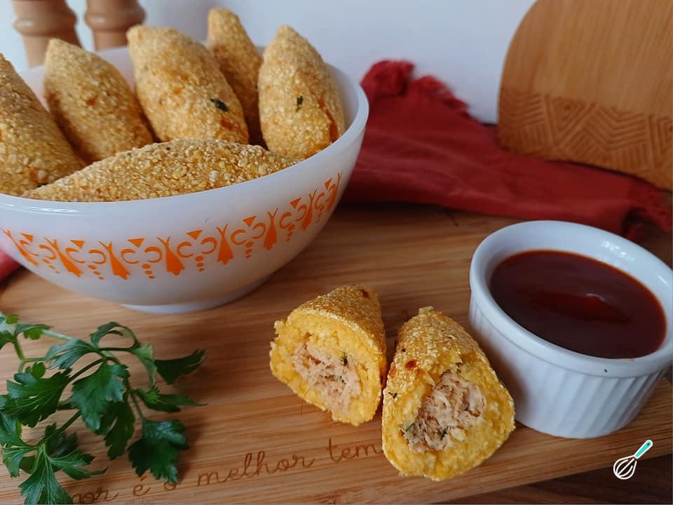 O bolinho recheado com o frango cozido é bem saboroso e combina com aquele lanchinho cheio de bate papo com a família e os amigos! Para esta receita usaremos a farinha de milho e a farinha de mandioca que irão proporcionar uma massa rica em sabor e textura!