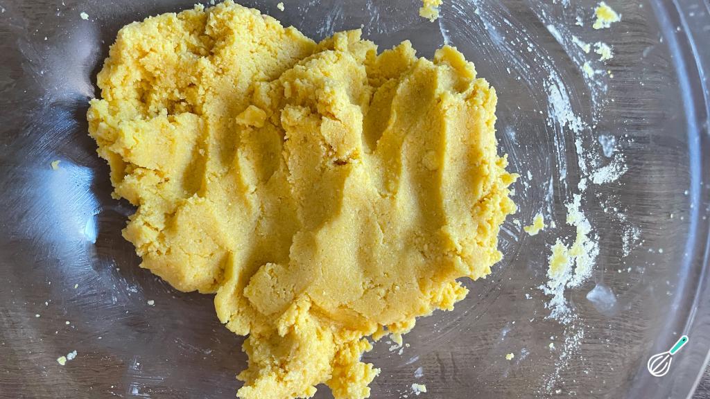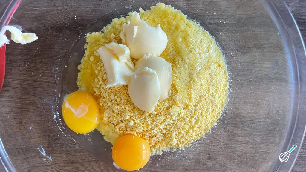 Numa tigela, adicione a farinha de milho, os ovos, a margarina ou a manteiga e o sal.