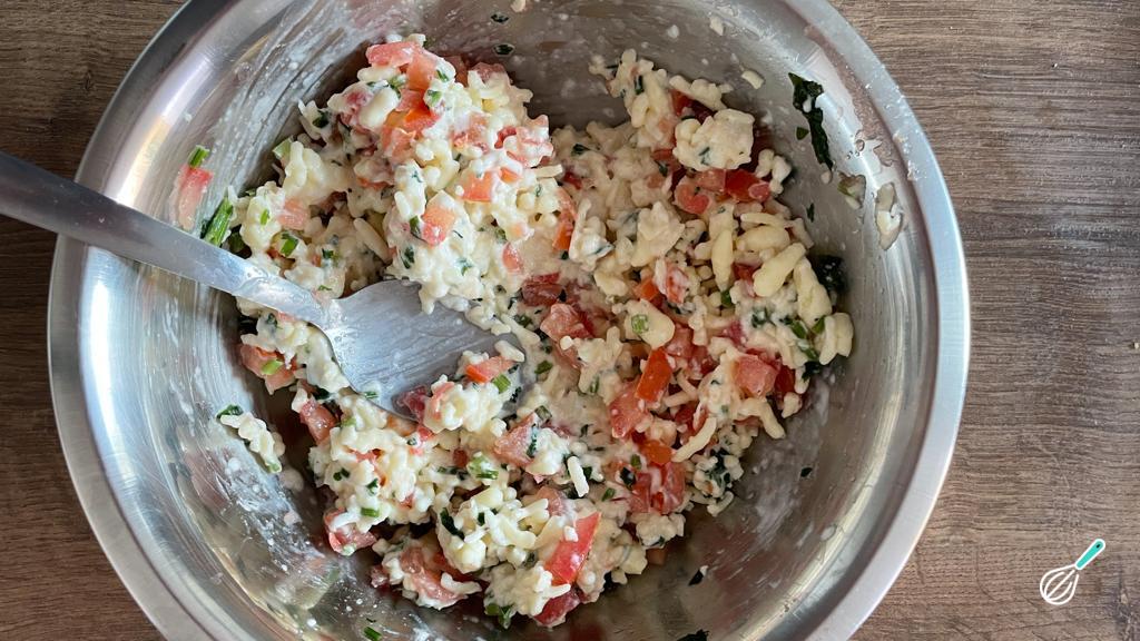Em outra tigela, misture o queijo, o requeijão, o tomate picado e a salsinha.