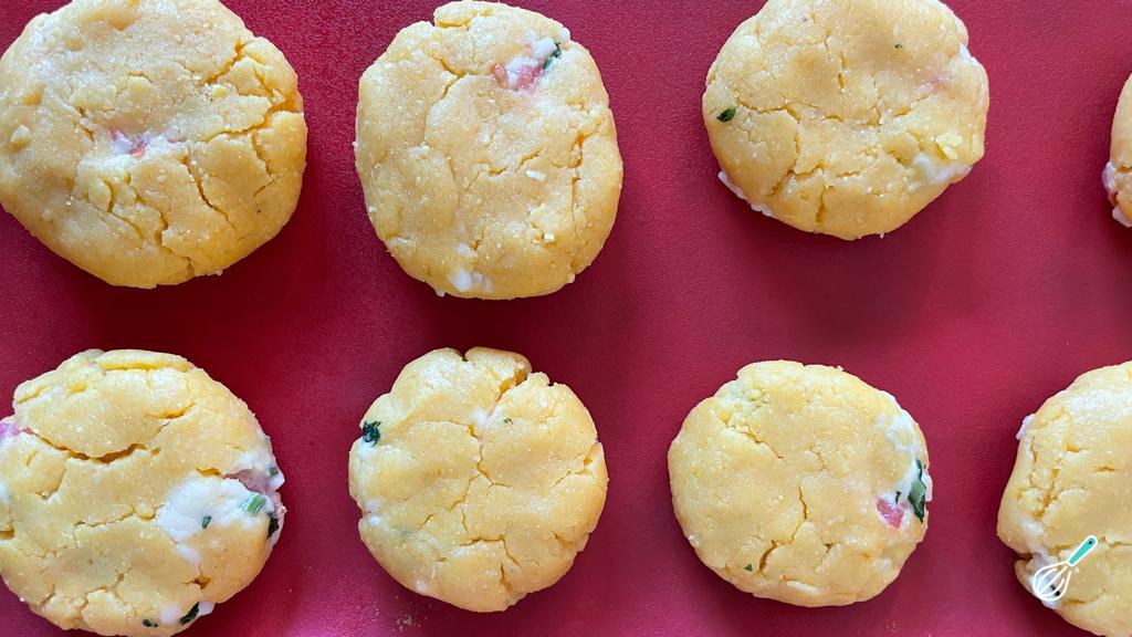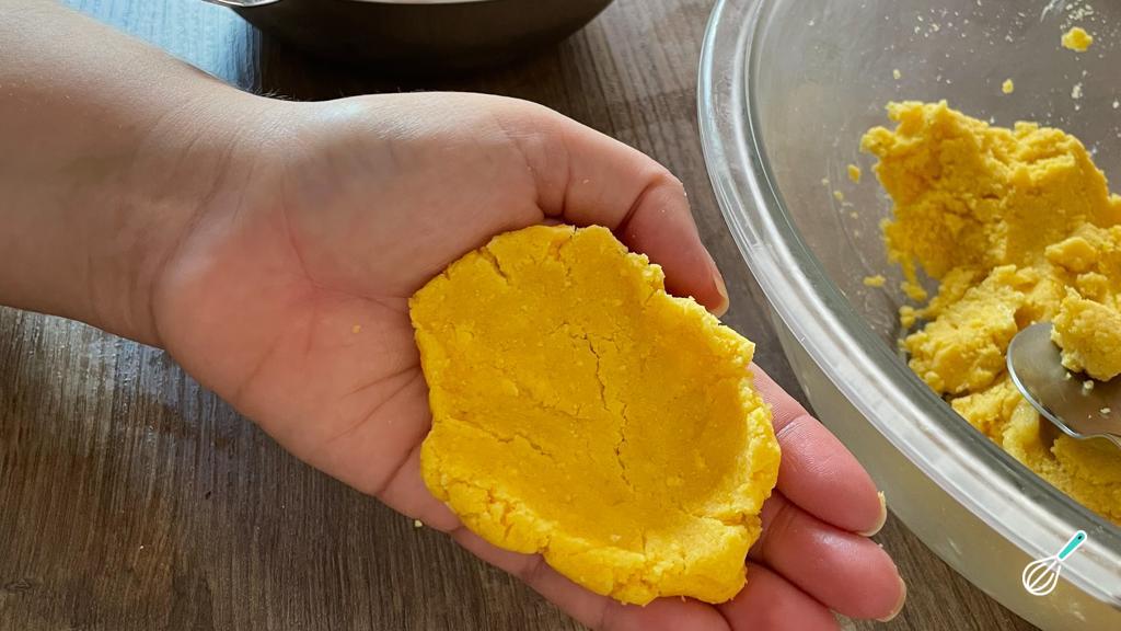 Abra a massa com as mãos, formando conchinhas, recheie e modele em discos.