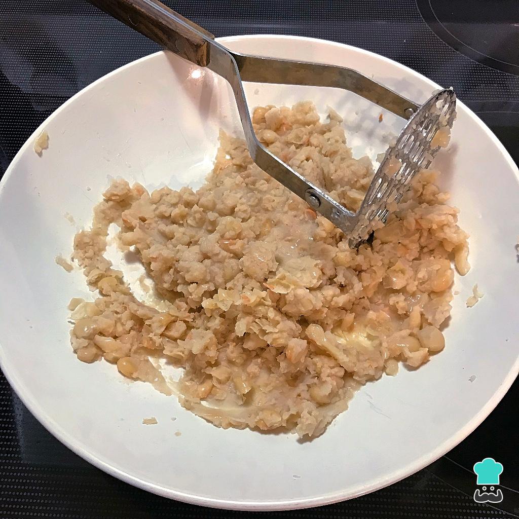 Escorra e lave o feijão (se você usar o de lata), depois amasse ele com um amassador de batatas ou um garfo.