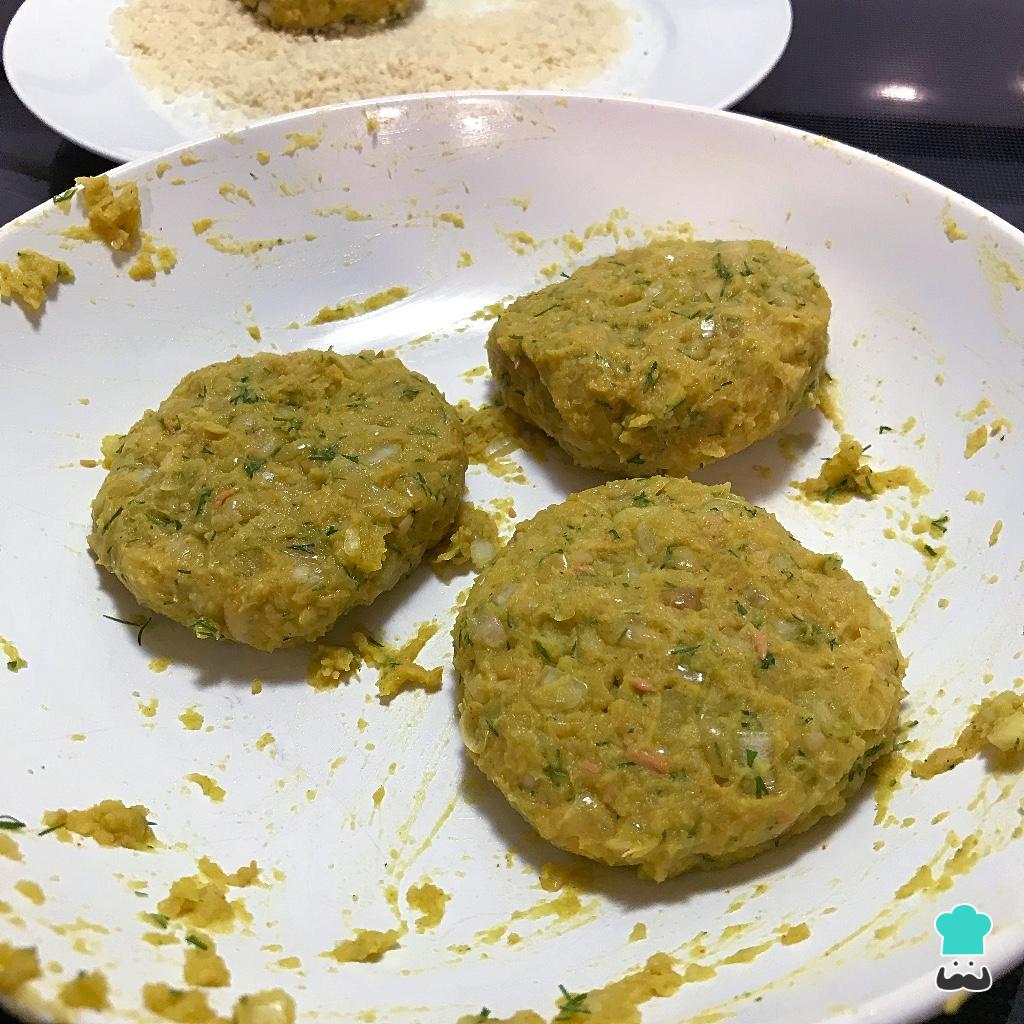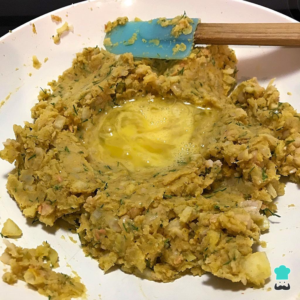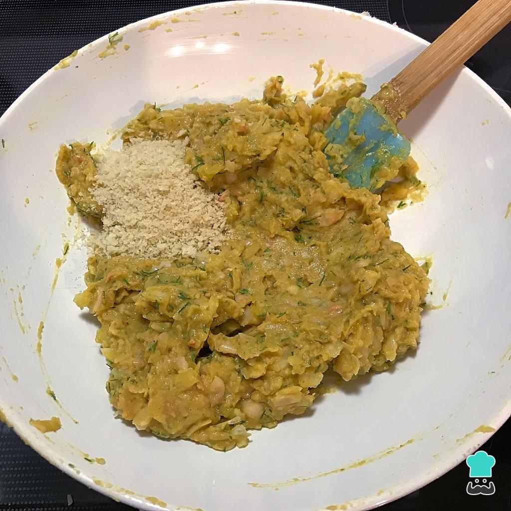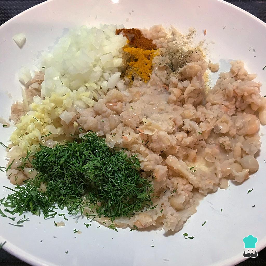 Misture a cebola, o alho, o dill e os temperinhos (sal, pimenta, cúrcuma, cominho, páprica, alho em pó e cebola em pó) com feijão branco já amassado.