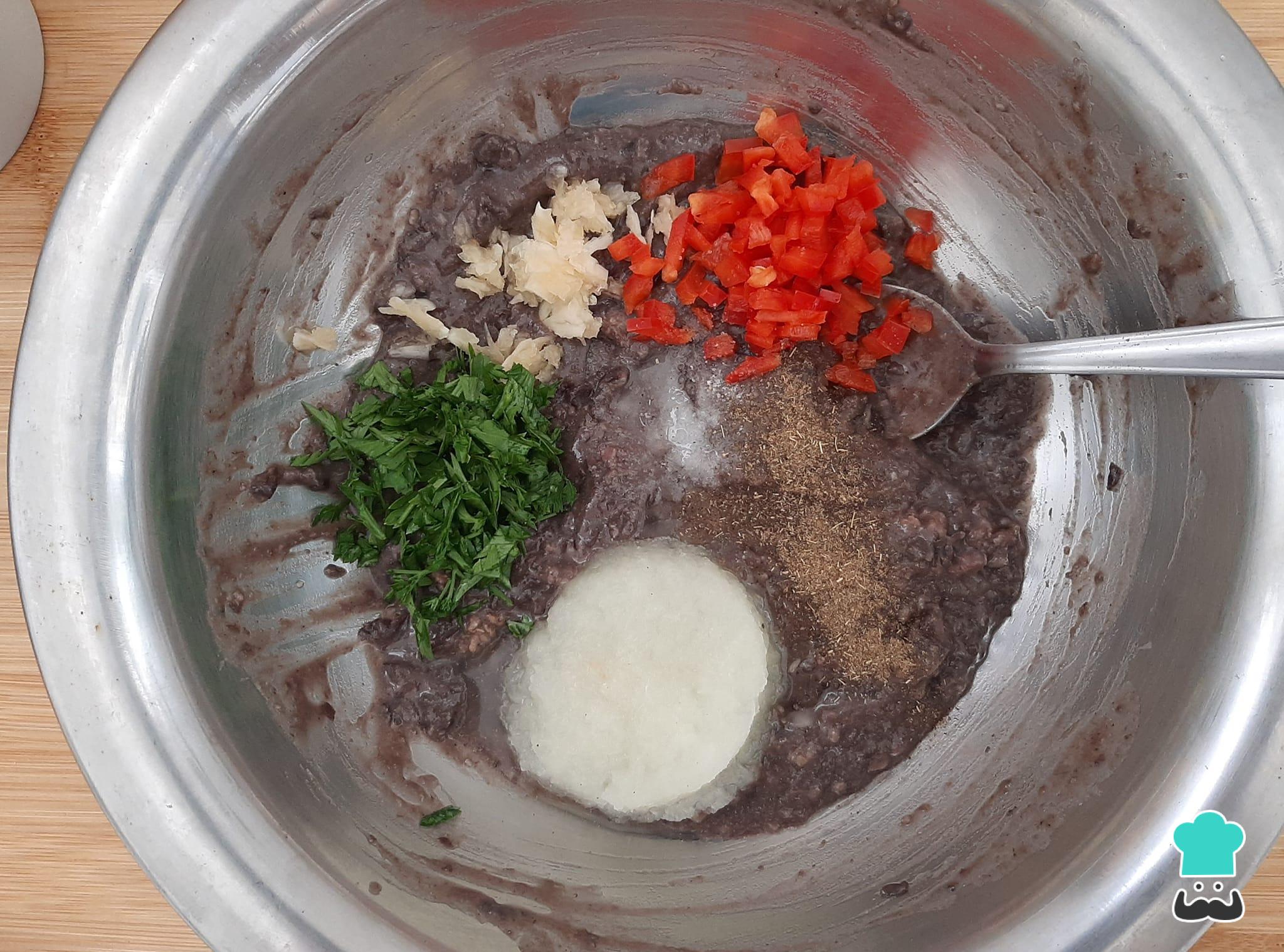Em seguida, junte o cheiro verde ao feijão amassado, a cebola ralada, o pimentão vermelho, o alho amassado, o sal e a pimenta do reino, misturando tudo.
