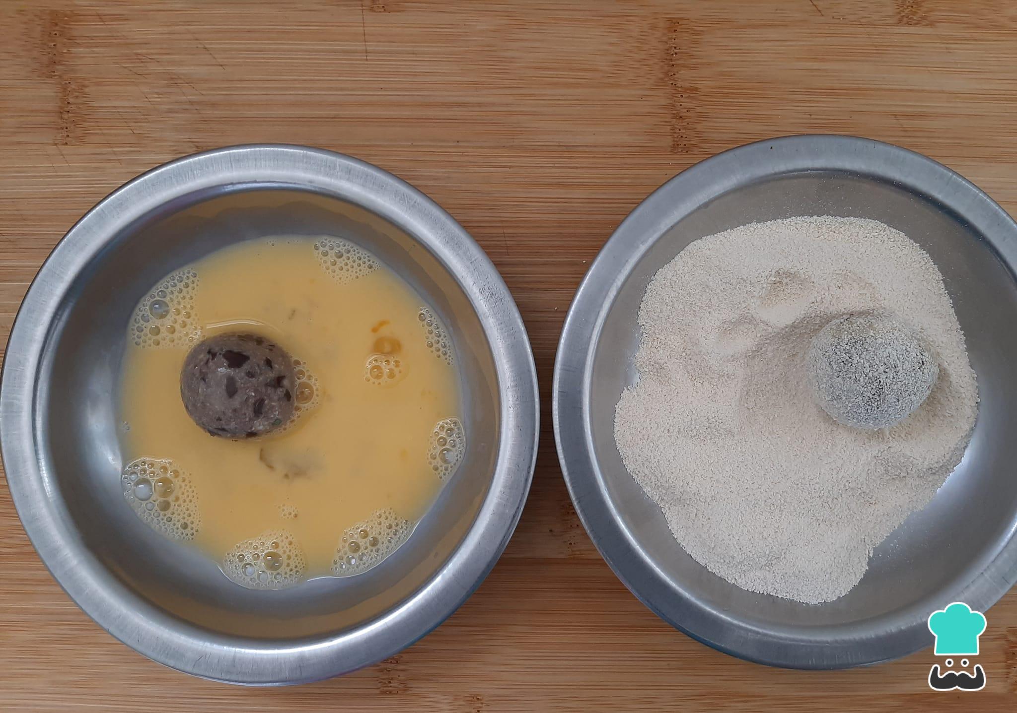 Depois de modelar todos os bolinhos, se quiser já poderá fritá-los em óleo quente. Caso prefira empaná-los acompanhe a instrução seguinte.