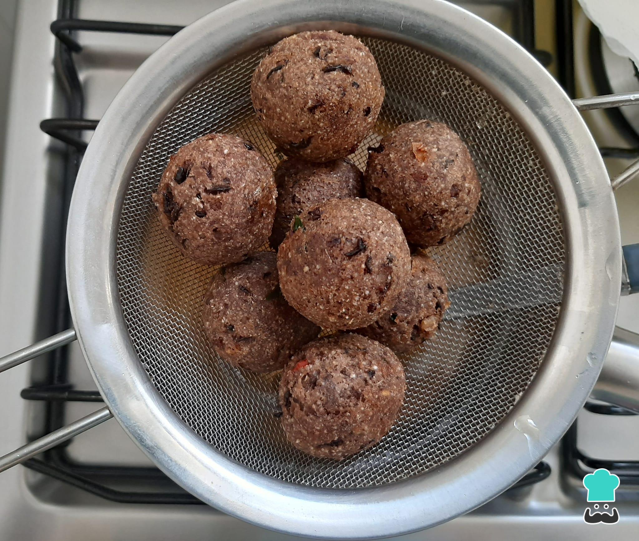 Frite os bolinhos em óleo quente (cerca de 1 minuto de cada lado) e retire-os quando estiverem com a casquinha crocante e dourada.
