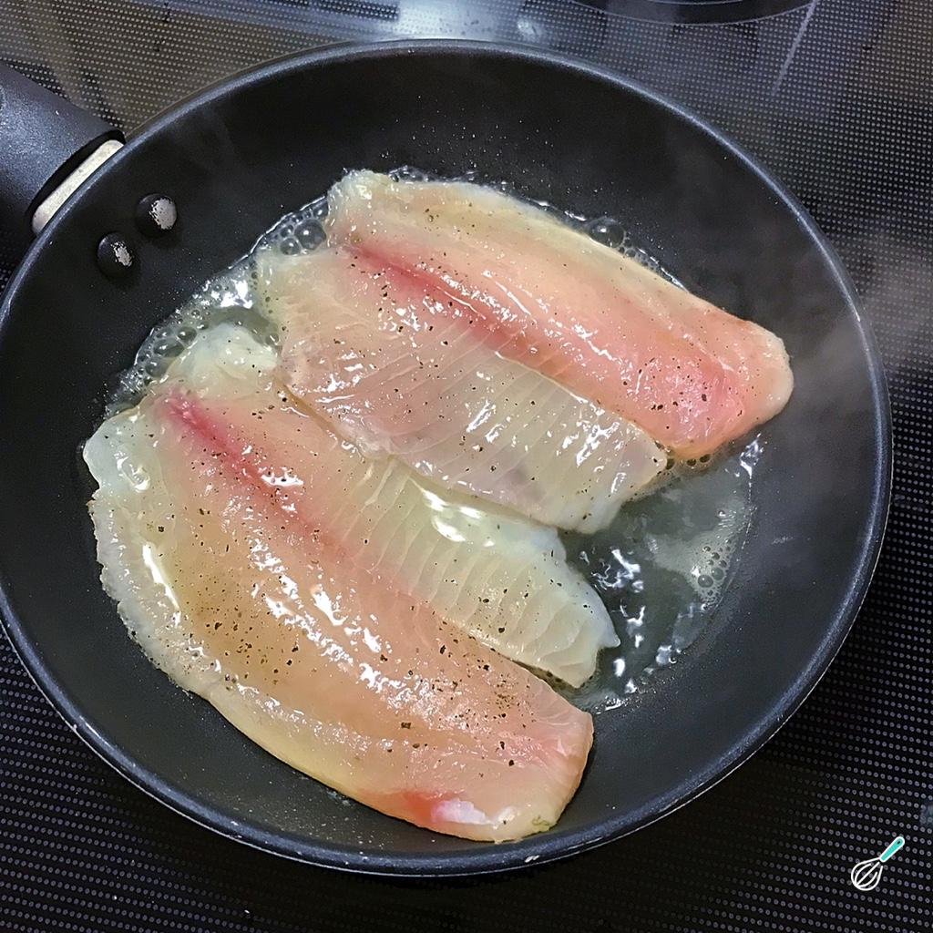 Tempere a tilápia com sal e pimenta. Numa frigideira quente coloque a tilápia e junte o suco de limão. Tampe e deixe cozinhar por 5 minutos, vire o peixe e cozinhe por mais 5 minutos. Reserve