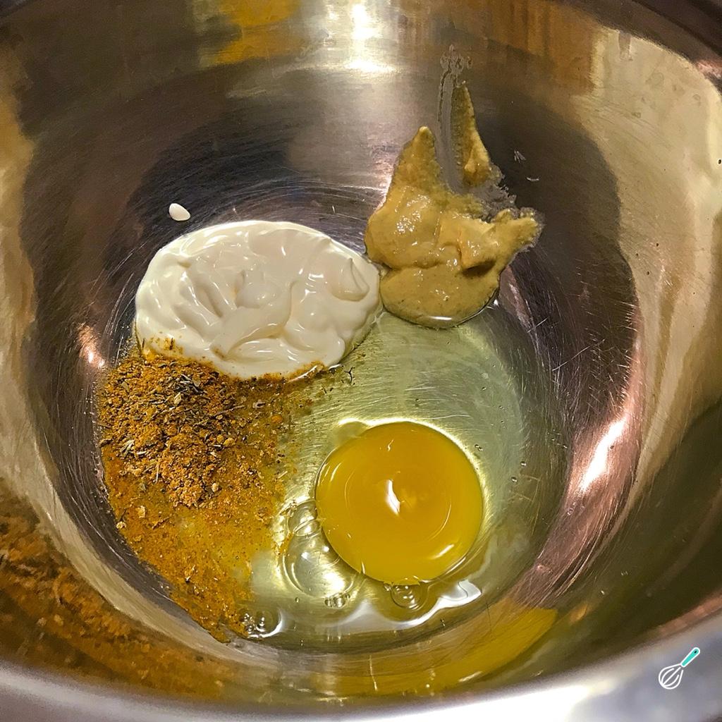 Numa vasilha misture o ovo com a maionese, a mostarda e o temperinho especial: misture quantidades iguais de mostarda em pó, cúrcuma, páprica, gengibre em pó, noz moscada, orégano, manjericão seco, tomilho seco, sal e pimenta. É esta mistura que irá conferir um sabor irresistível a este bolinho de filé de tilápia, por isso não deixe de preparar!