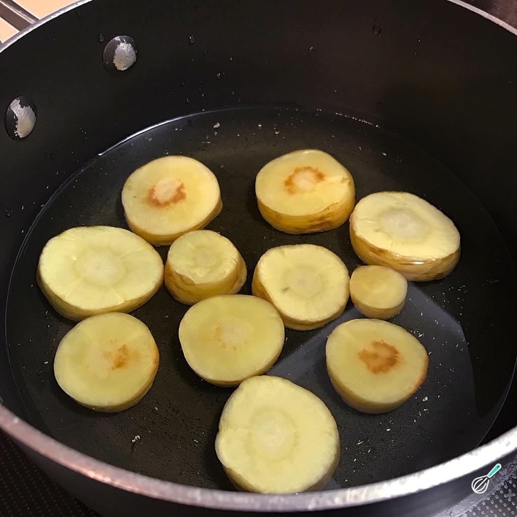 Comece cozinhando a pastinaca em rodelas numa panela com água até que fique bem macia.