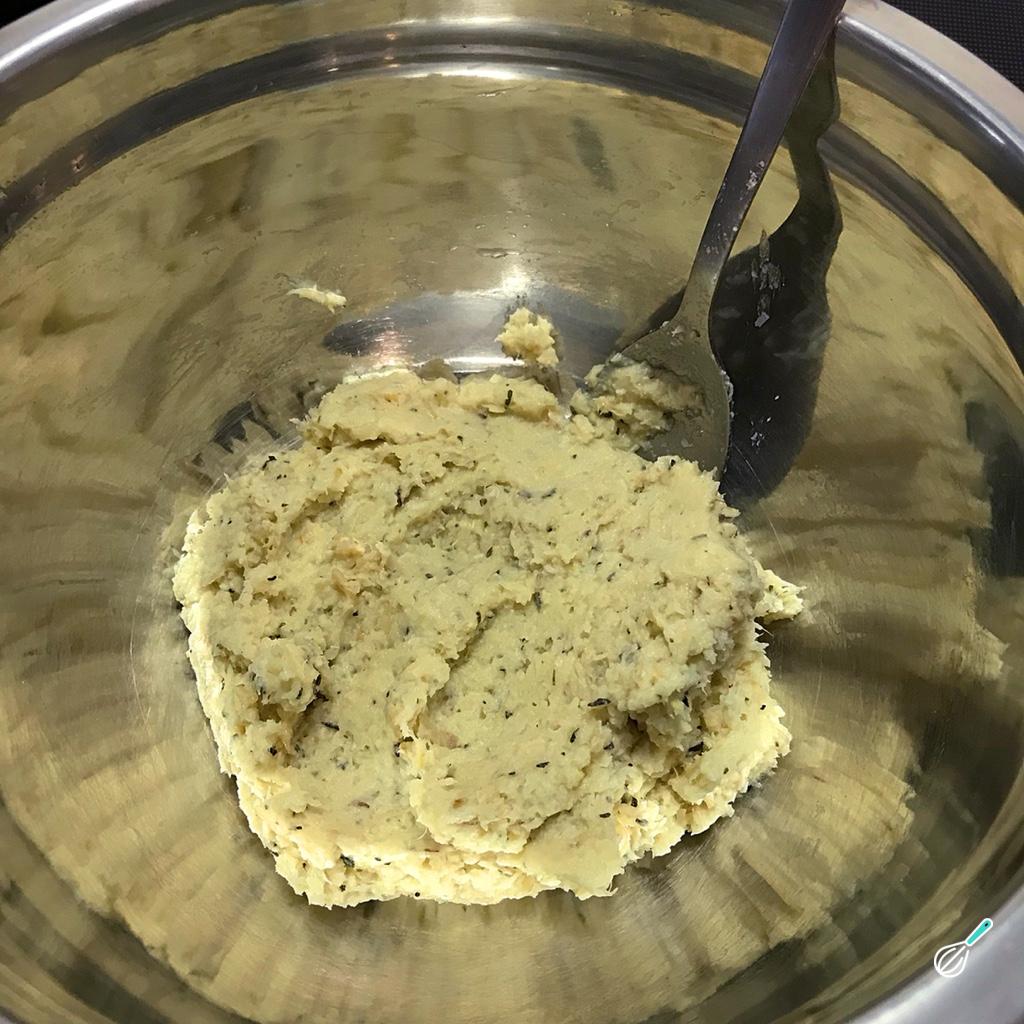 Bata a pastinaca no liquidificador junto com as ervas, o azeite, a água, o sal e a pimenta até formar uma massa. Junte o frango e misture ou volte a bater.