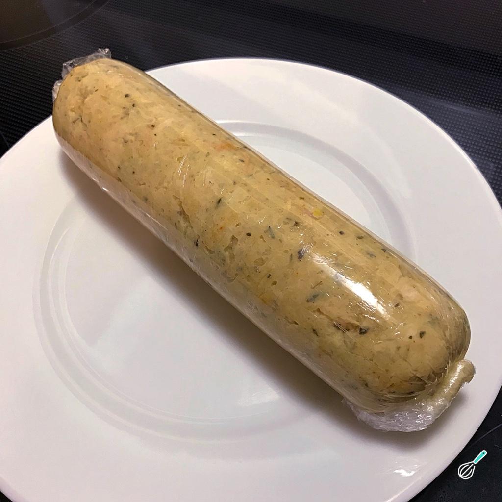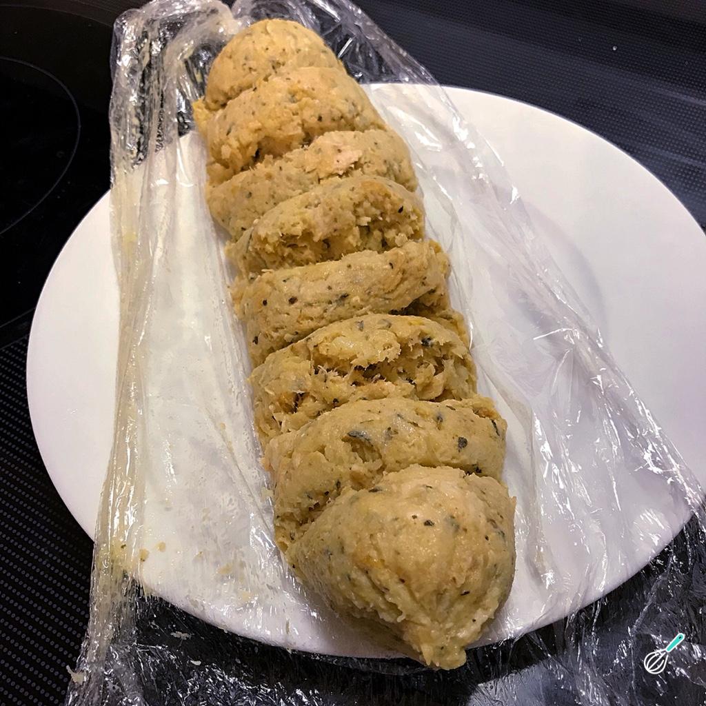 Você pode moldar o bolinho de frango na mão, mas eu prefiro enrolar a massa num papel filme e dar o formato de uma salsicha.