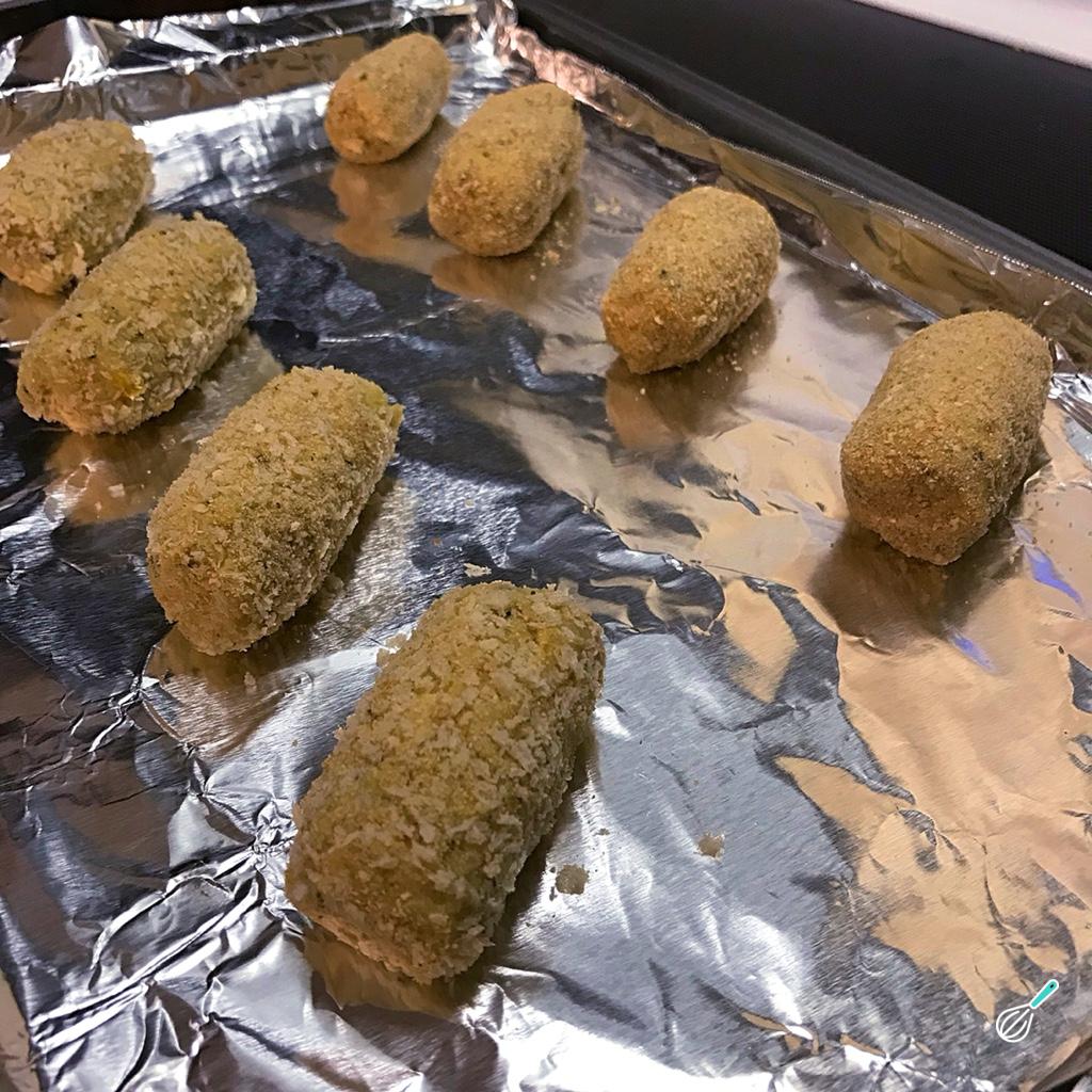 Passe os bolinhos na farinha de rosca ou no panko (fiz meio a meio) e distribua sobre uma assadeira forrada com papel alumínio.