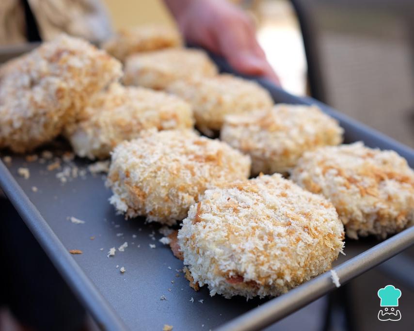 Forme bolinhos de tamanho igual e passe pela farinha - eu usei grão de bico crocante triturado para empanar, mas você pode usar farinha de mandioca, farinha de milho ou outra farinha sem glúten ao seu gosto. Coloque os bolinhos em uma forma com papel manteiga ou antiaderente.
