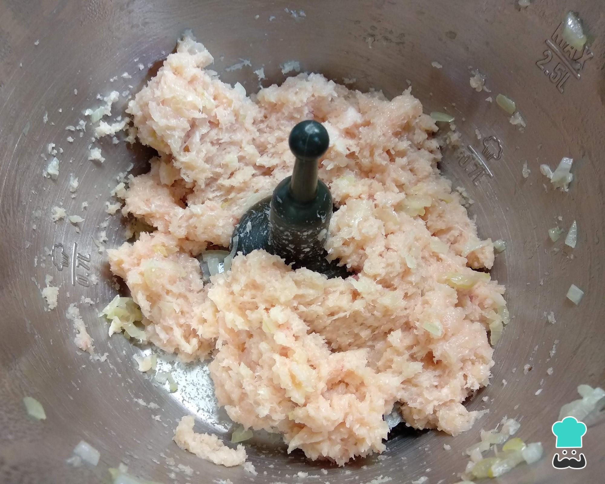 Comece por refogar a cebola no azeite até murchar. Transfira para um processador ou robot de cozinha, adicione o frango cortado em pedaços e bata até virar carne moída, como na foto.