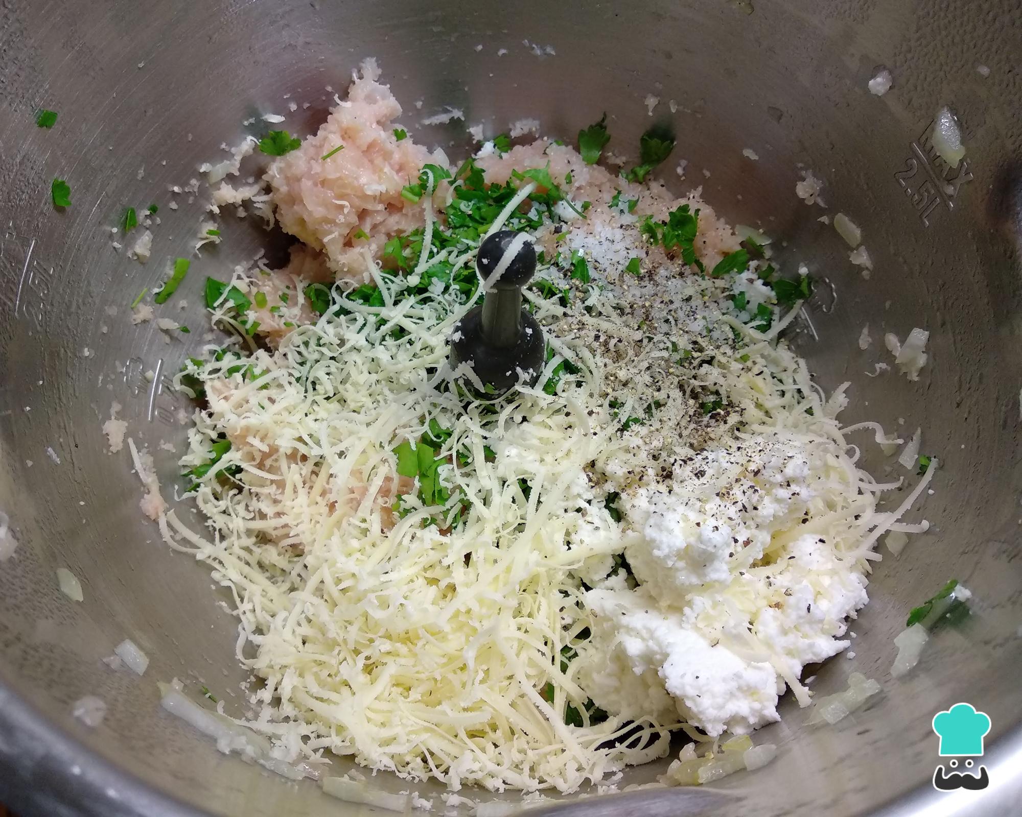 Adicione os restantes ingredientes: a ricota, o queijo ralado, a salsinha, pimenta do reino e sal a gosto. Bata novamente até misturar tudo muito bem.