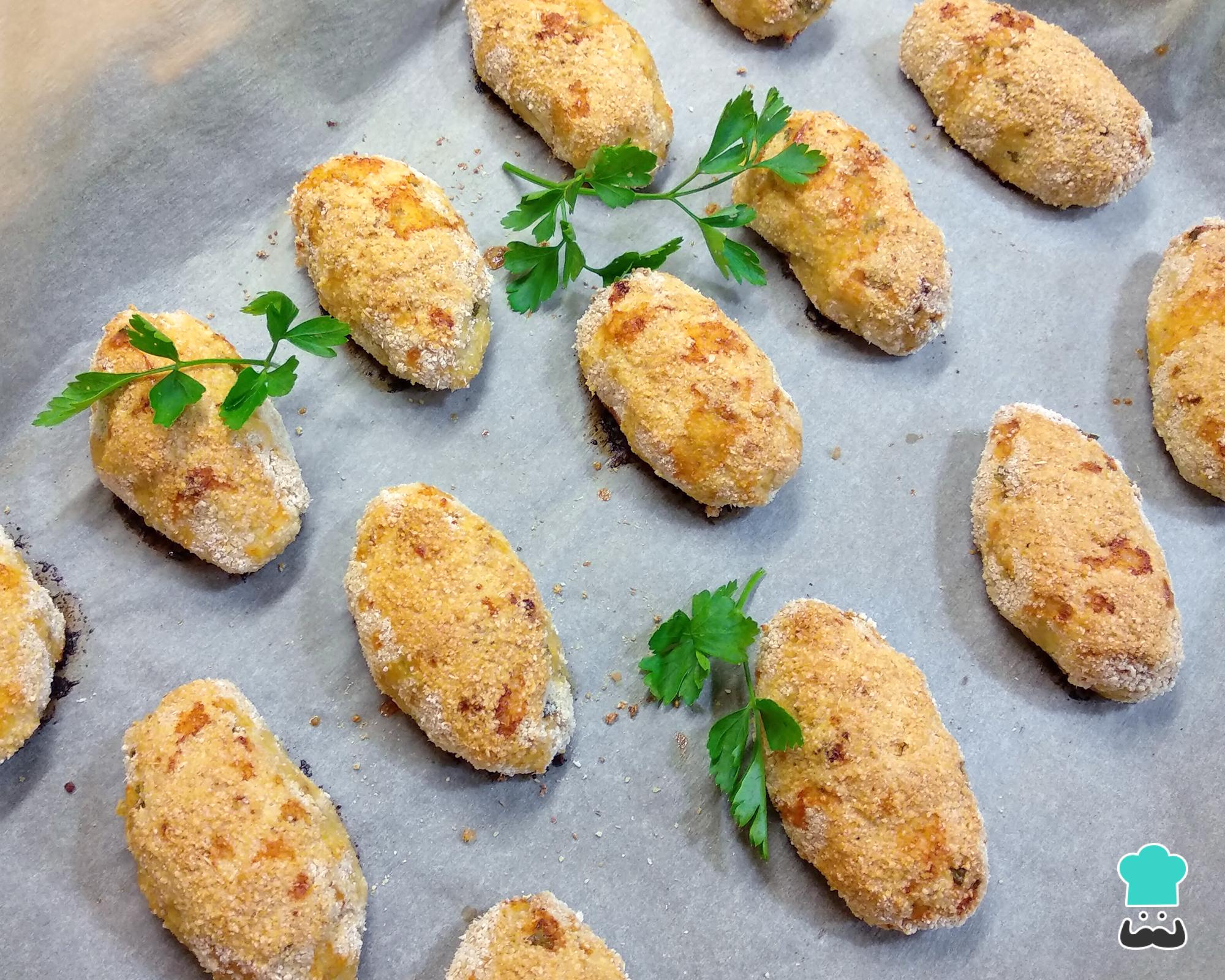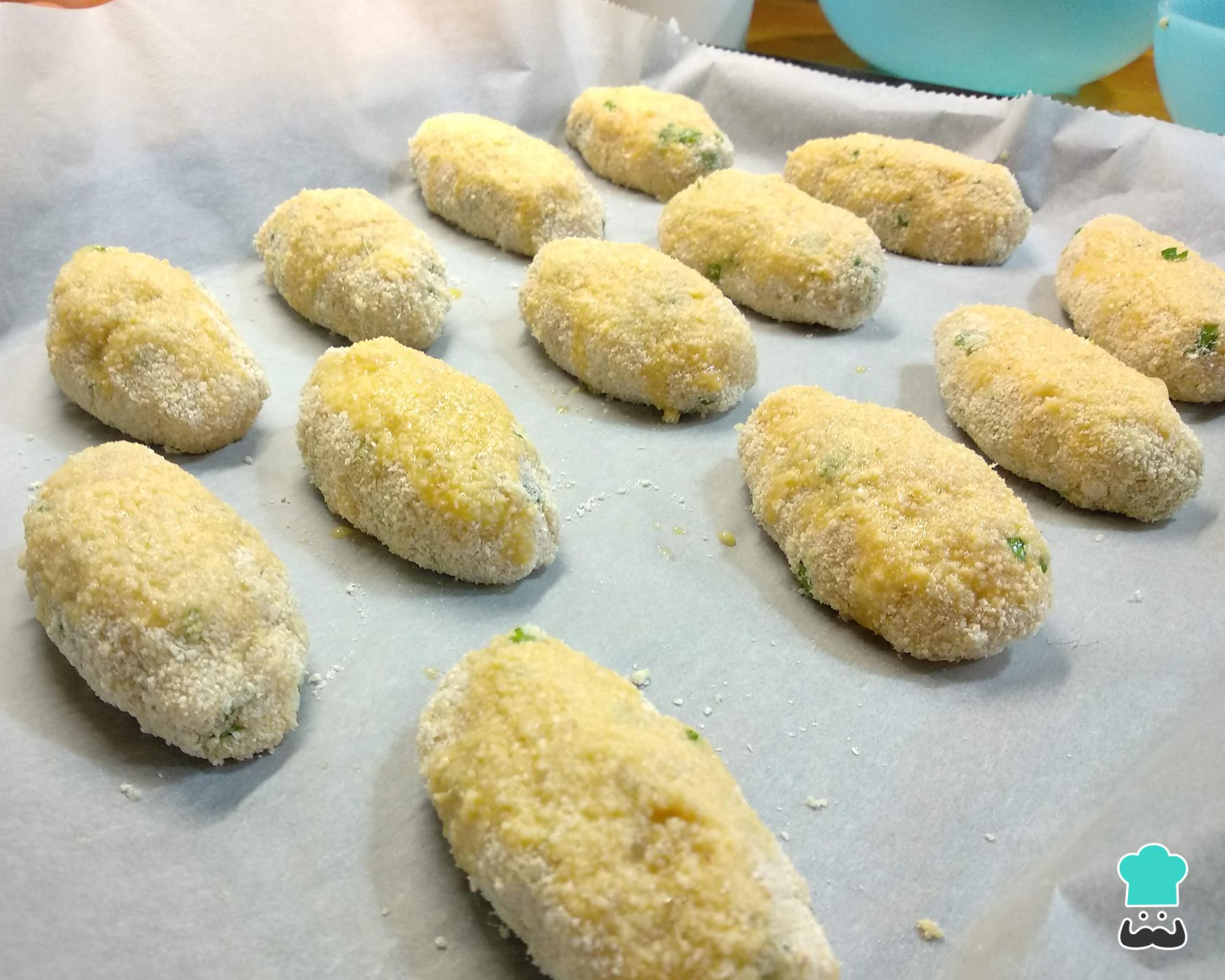 Depois de empanar todos os bolinhos pincele-os com o ovo batido que sobrou. Coloque assando no forno pré-aquecido a 180ºC por 10-20 minutos ou até dourarem.