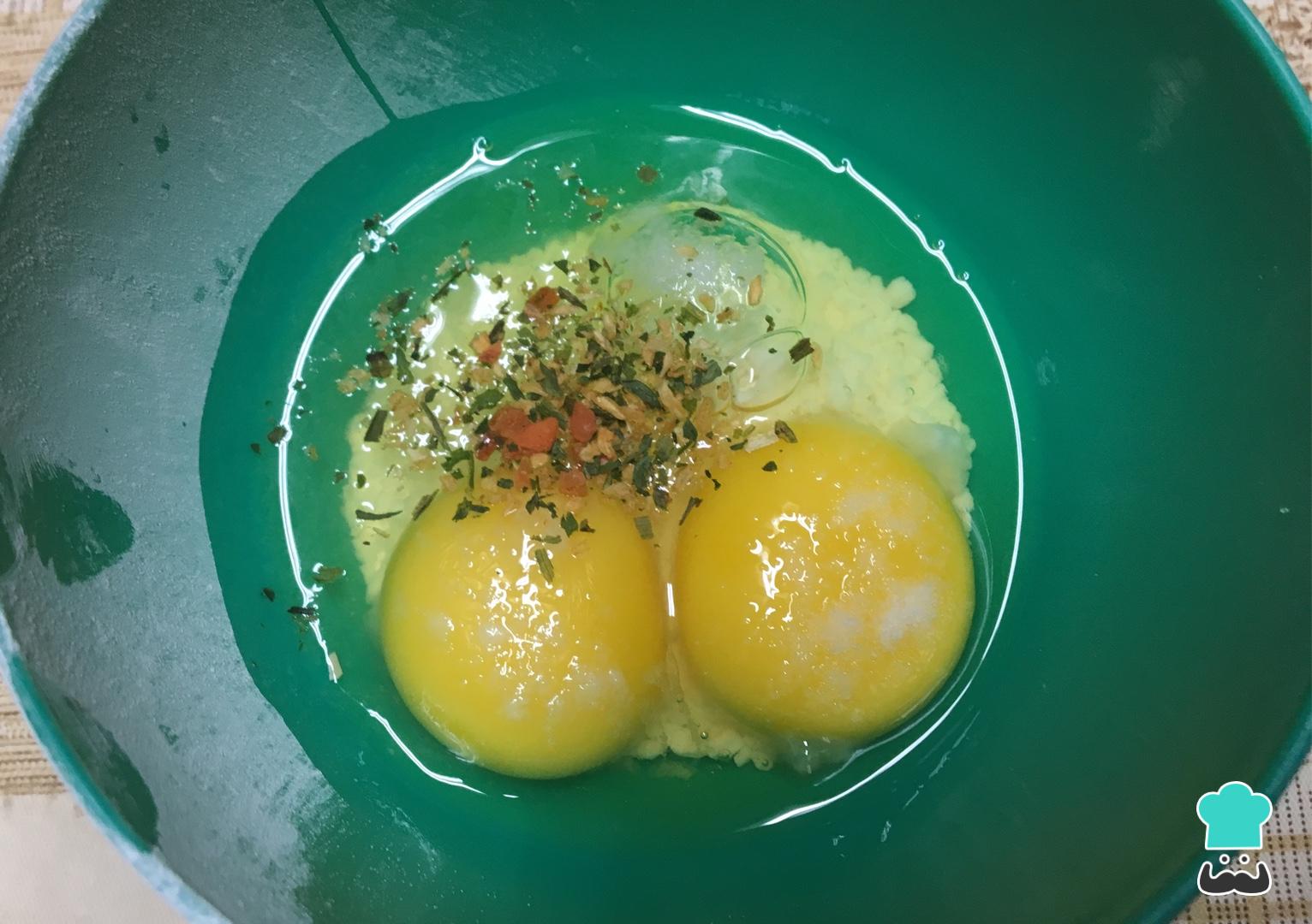 Bata os ovos com a tapioca, sal e tempero a gosto.