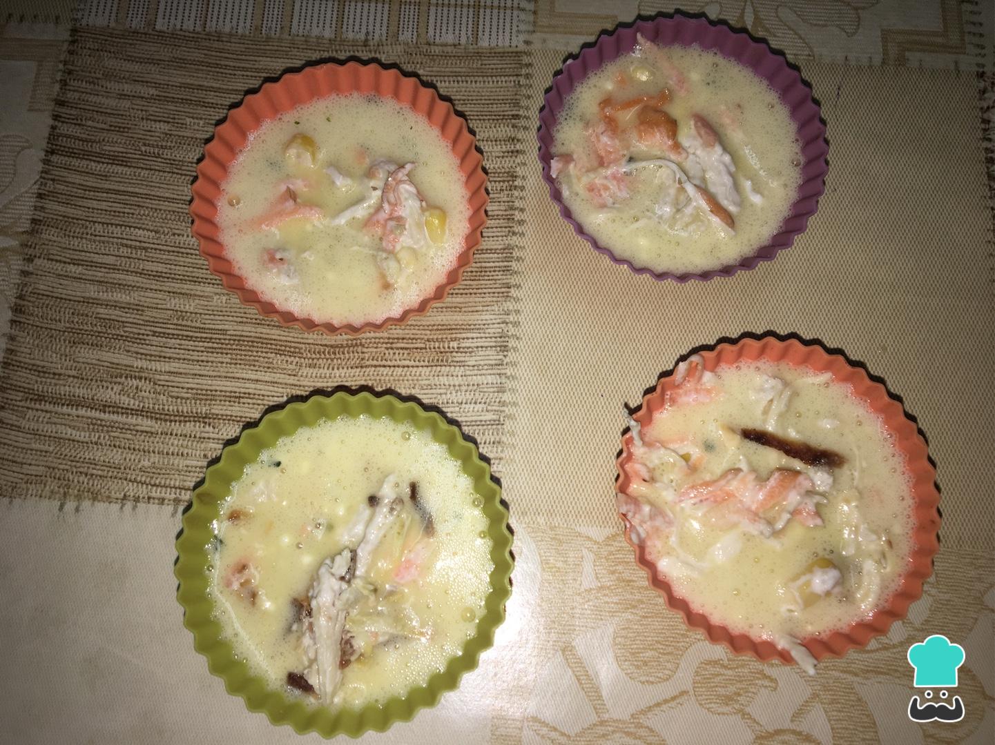Coloque a mistura dos ovos na forminha, coloque o frango por cima e leve para assar na AirFryer por 7 minutos a 180 graus, ou no forno até dourar.