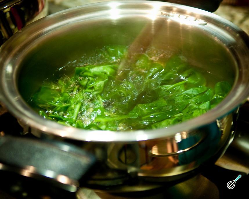 Comece por ferver as acelgas ou os espinafres em água com um pouco de sal por 5-7 minutos. Retire e deixe escorrendo.