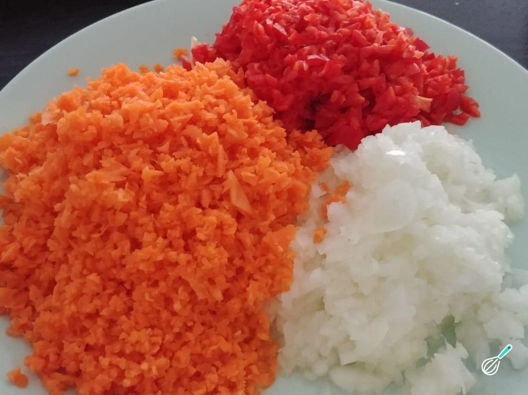 Ao mesmo tempo pique finamente ou rale as cenouras, a cebola e o pimentão de forma a ficarem como na fotografia.