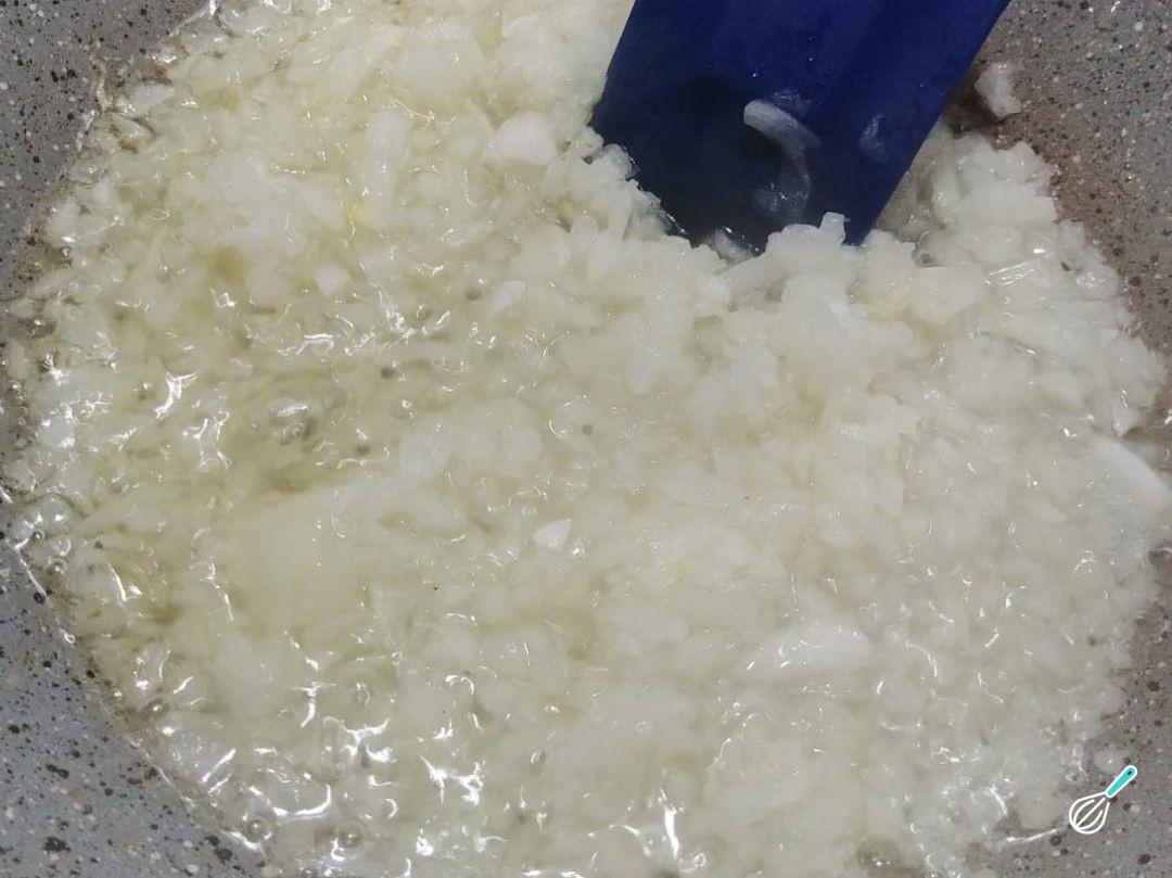 Leve ao fogo uma panela com um pouco de azeite e refogue a cebola até ficar transparente.