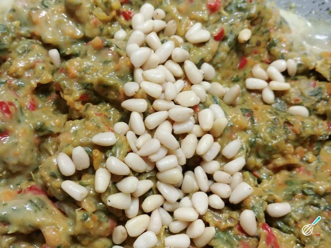 Por fim junte a bebida de soja e os pinolis ou cajus picados, para conferir uma textura deliciosa. Desligue o fogo, misture bem e deixe a massa esfriar um pouco.