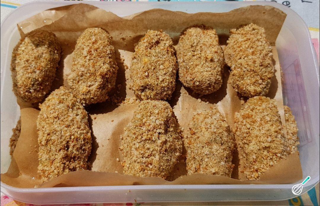 Separe porções de massa com as mãos e modele em forma de bolinhos alongados. Envolva em farinha de rosca, coloque num recipiente e reserve na geladeira por 30 minutos, para firmar.