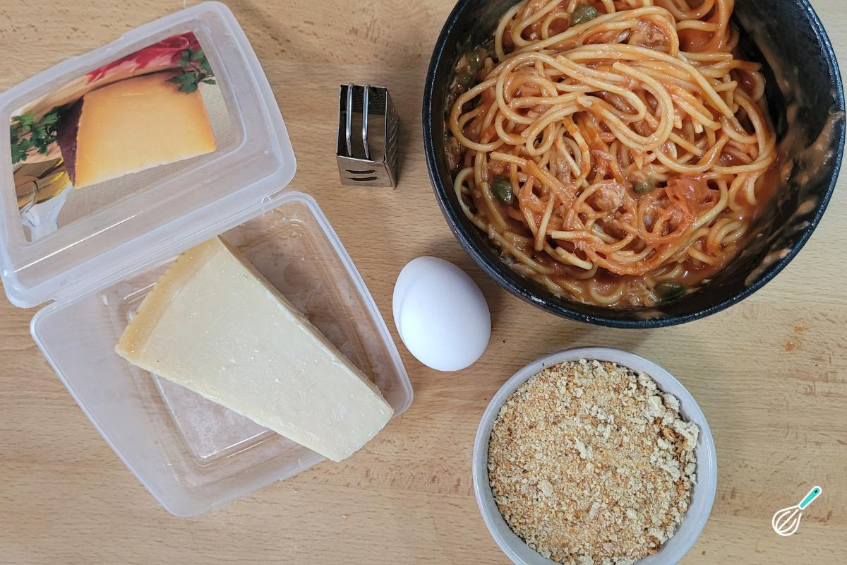 Separe os ingredientes para fazer seus bolinhos de macarrão. Você pode usar qualquer massa que tiver sobrado (incluindo o molho), pode ser massa curta ou massa longa. Aqui usei um espaguete com molho de tomate, atum e alcaparras. O ideal é que a massa esteja gelada para ficar mais fácil de trabalhar.