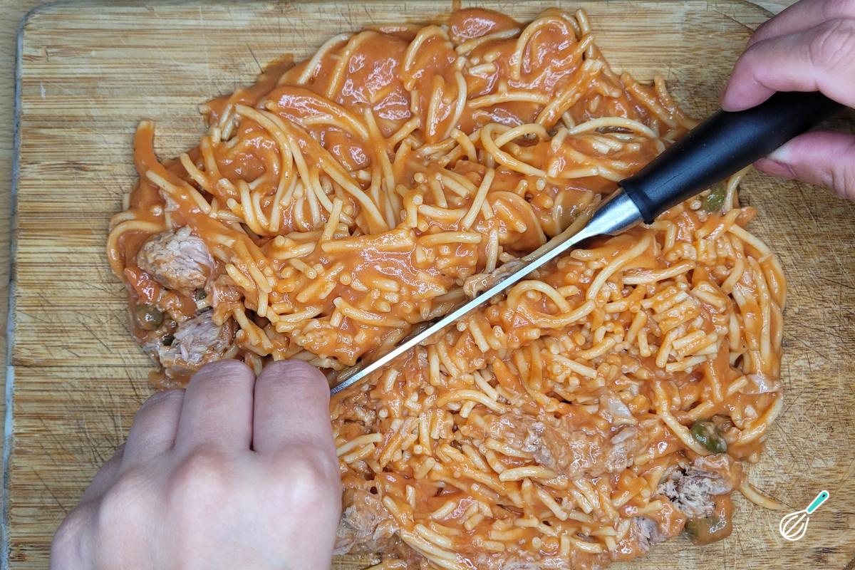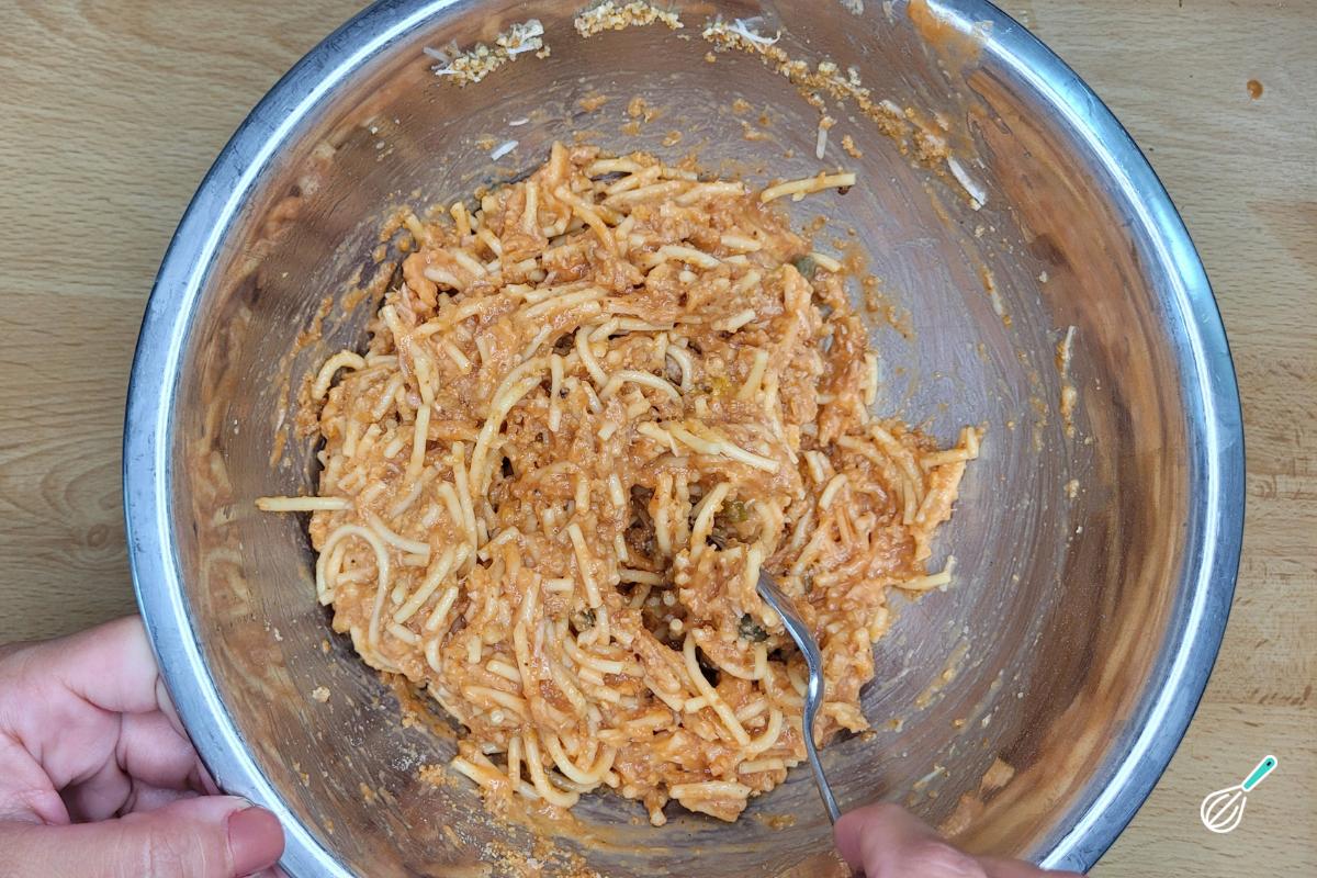 Essa etapa é opcional, mas eu gosto de dar uma picada na massa para ficar mais fácil de misturar e modelar (principalmente se for uma massa longa como o espaguete, mas você pode fazer isso para massas mais curtas também). Se tiver muito mais molho do que macarrão ou se o molho estiver muito líquido, pode escorrer também o excesso.