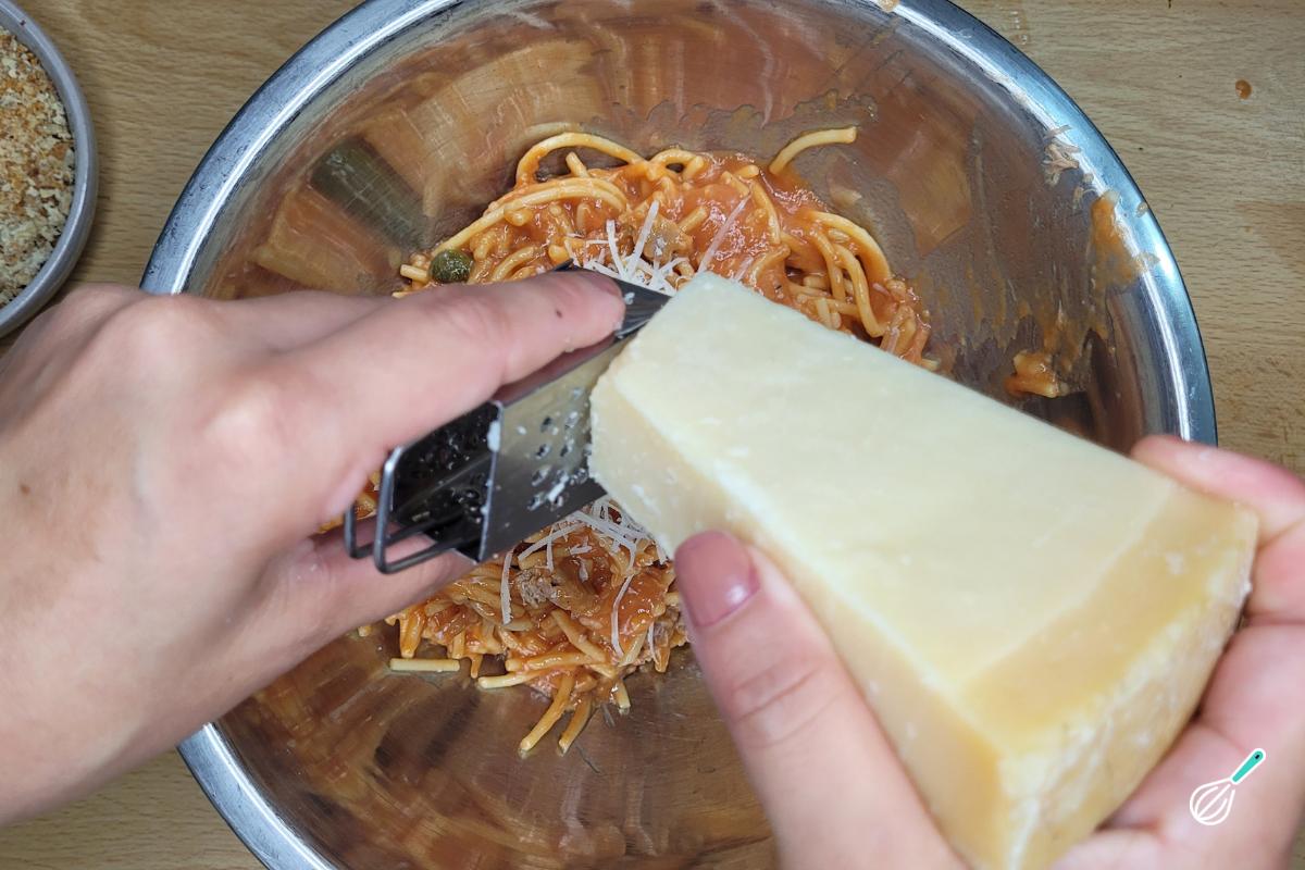 Coloque o macarrão picado junto com o molho em uma tigela. Misture o parmesão ralado (eu gosto de ralar na parte fina do ralador para misturar melhor na massa).