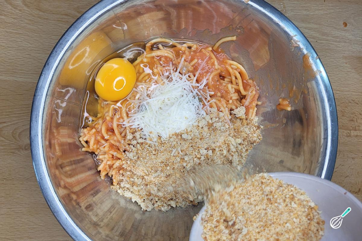 Adicione o ovo e por último, adicione a farinha de rosca. Se tiver uma quantidade maior de macarrão, pode colocar um pouco mais de farinha de rosca.
