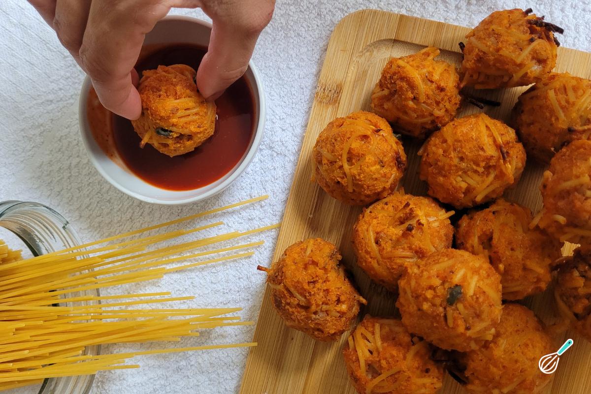 Seus bolinhos de macarrão estão prontos para serem servidos. Eles ficam perfeitos servidos com um molhinho picante.